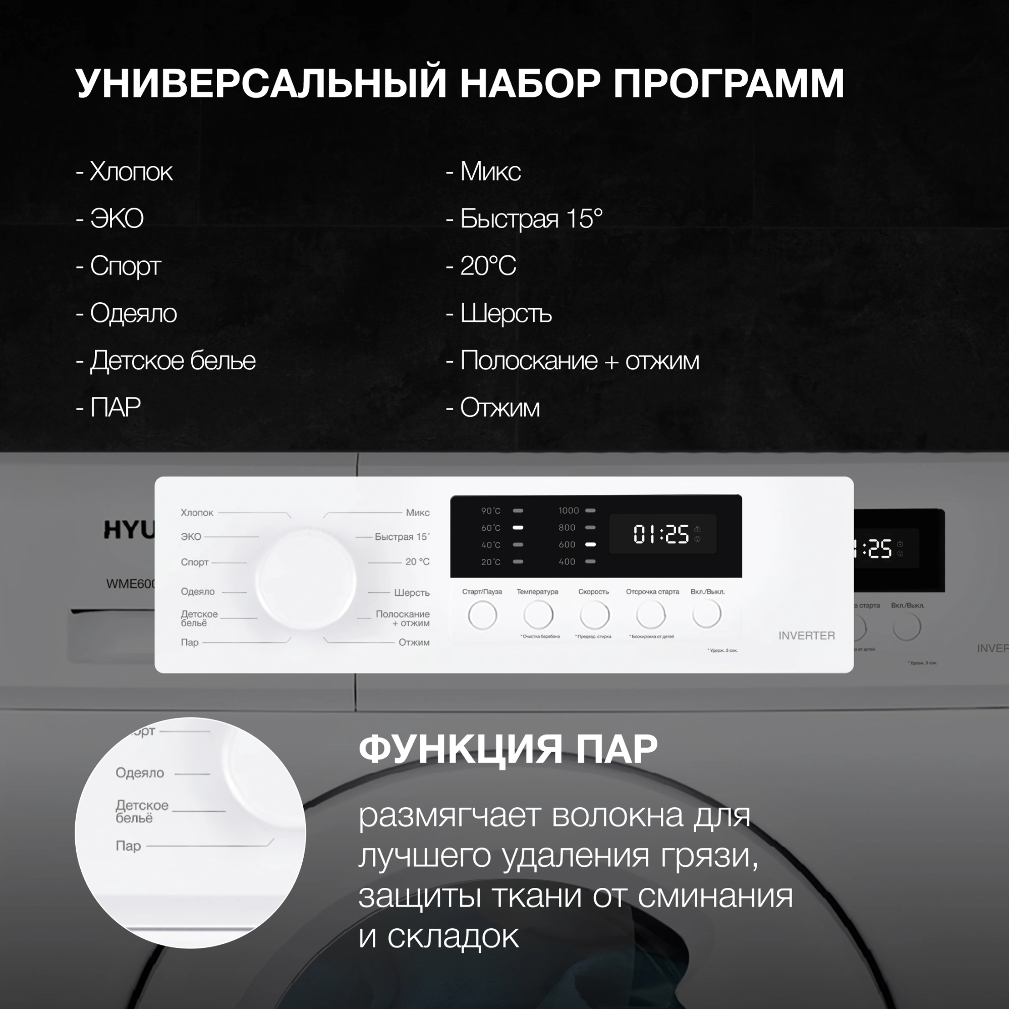 Хлопок, ЭКО, Деликатная, Нижнее белье, Шерсть, Одеяло, Смешанная стирка, Синтетика, Детское белье, Быстрая 15 мин., Полоскание+отжим, Отжим