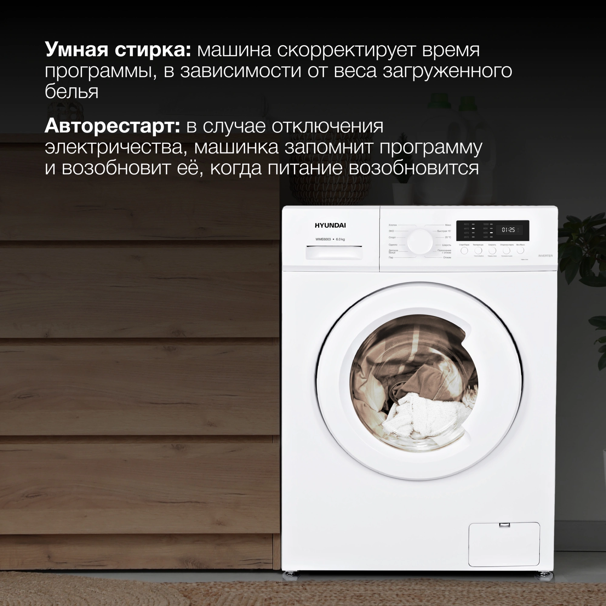 Стиральная машина WME6003 с глубиной 44 см выполнена в белоснежном цвете, материал барабана — нержавеющая сталь, устойчивая к коррозии. Машина снабжена 12 программами стирки, которые пригодятся семьям с детьми и любителям быстрой стирки. Ведь среди специальных режимов — стирка за 15 минут, которая включает в себя основные циклы стирки, полоскания и отжима, и поддерживает свежее состояние одежды. Второй специальный режим — стирка детского белья. Программа работает при максимальной температуре и уверенно справляется с пятнами на одежде, от шариковой ручки до засохшего яблочного пюре. И, наконец, программа самоочистки барабана, которая предотвращает неприятные запахи и налет на барабане, продлевая срок службы машины.