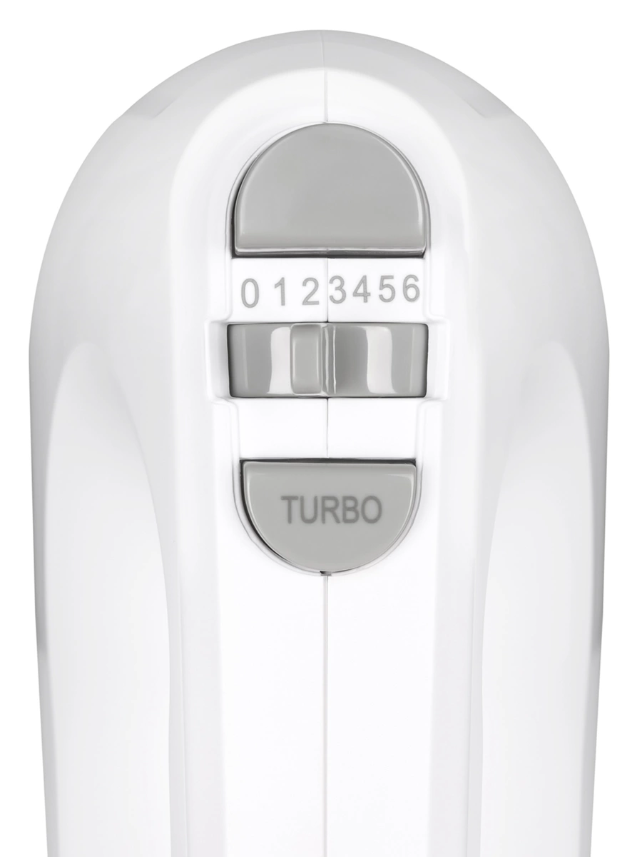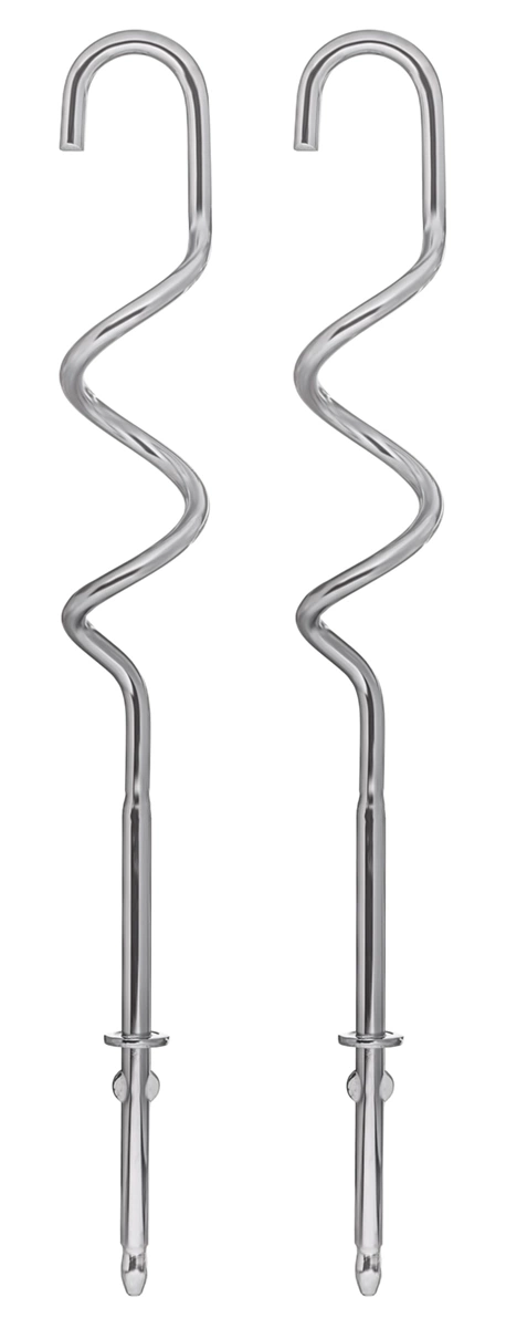 • В комплекте прилагается два набора насадок: венчики для взбивания и клюки для теста. Насадки изготовлены из нержавеющей стали, что значительно продлевает их срок эксплуатации и позволяет работать с горячими продуктами. Для их извлечения из гнезда предусмотрена специальная кнопка, располагающаяся над кнопкой выбора скорости работы на ручке прибора;