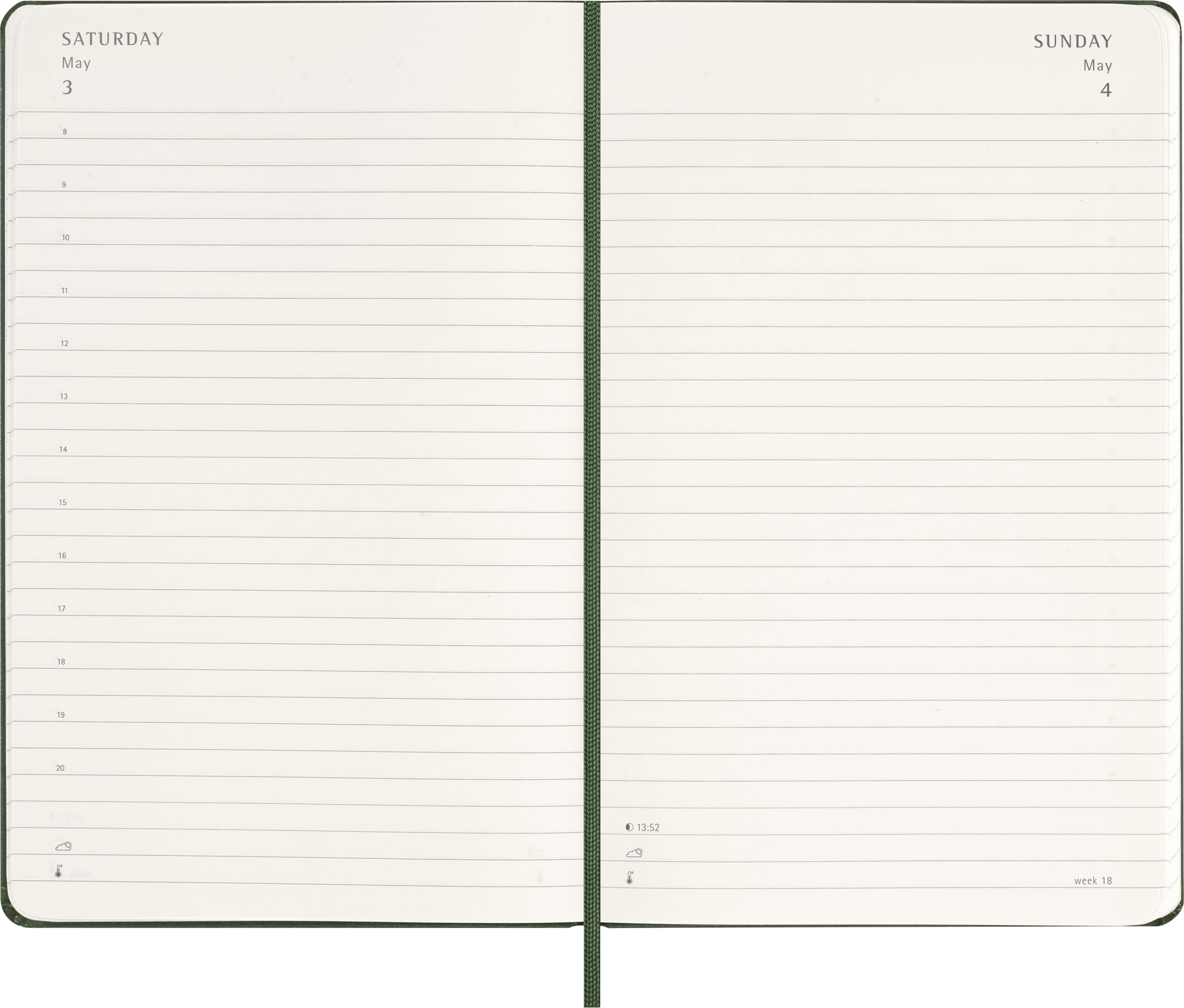 Ежедневник Moleskine датирован с января по декабрь. Данный формат предусматривает отдельную страницу для каждого дня. Фиксирующая резинка, закладка и кармашек для документов. 3 вида наклеек в комплекте