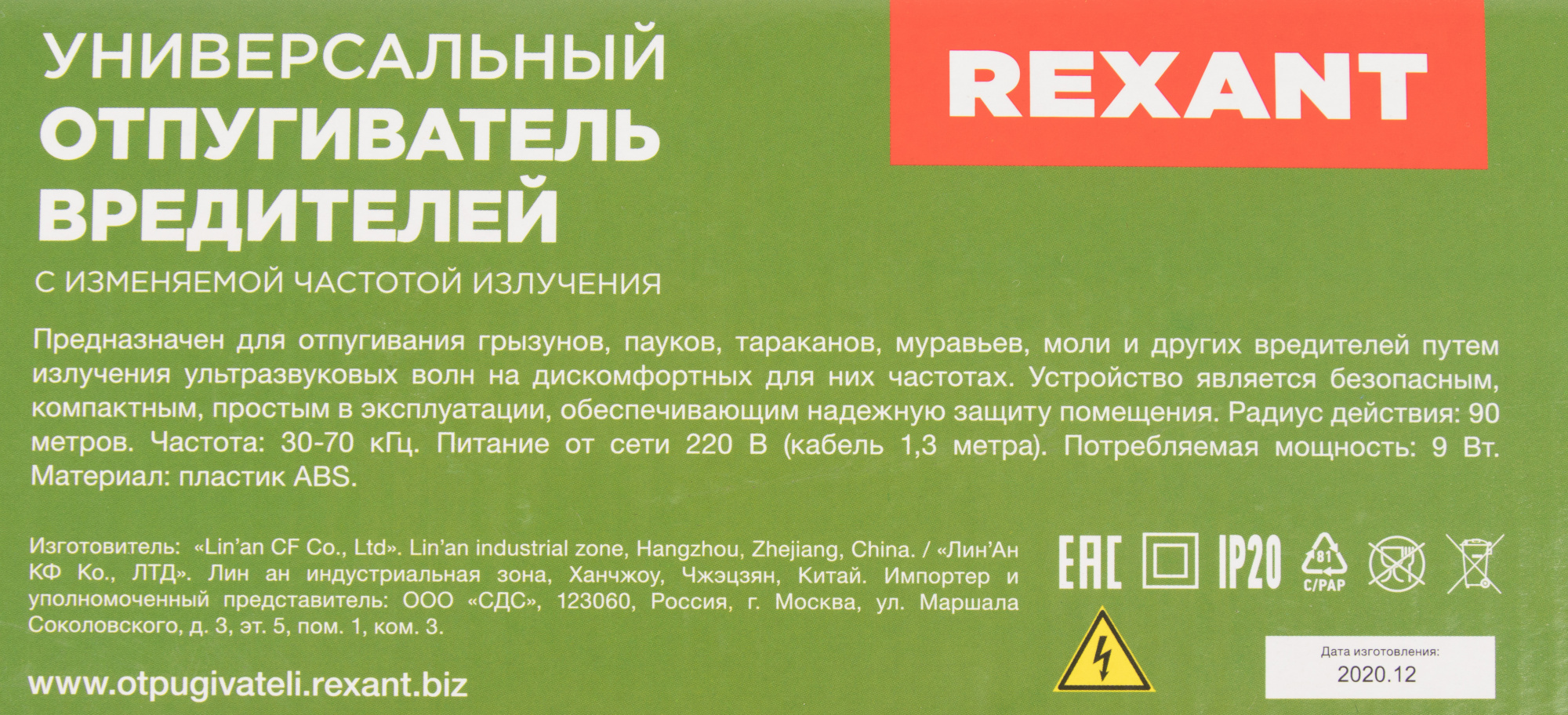 Всего один отпугиватель REXANT способен избавить дом площадью 90 кв м от целого списка вредителей: грызунов, тараканов, пауков, муравьев, моли, блох и т.д. Прибор излучает ультразвуковые волны, которые раздражают животных и насекомых, они стремятся покинуть территорию.