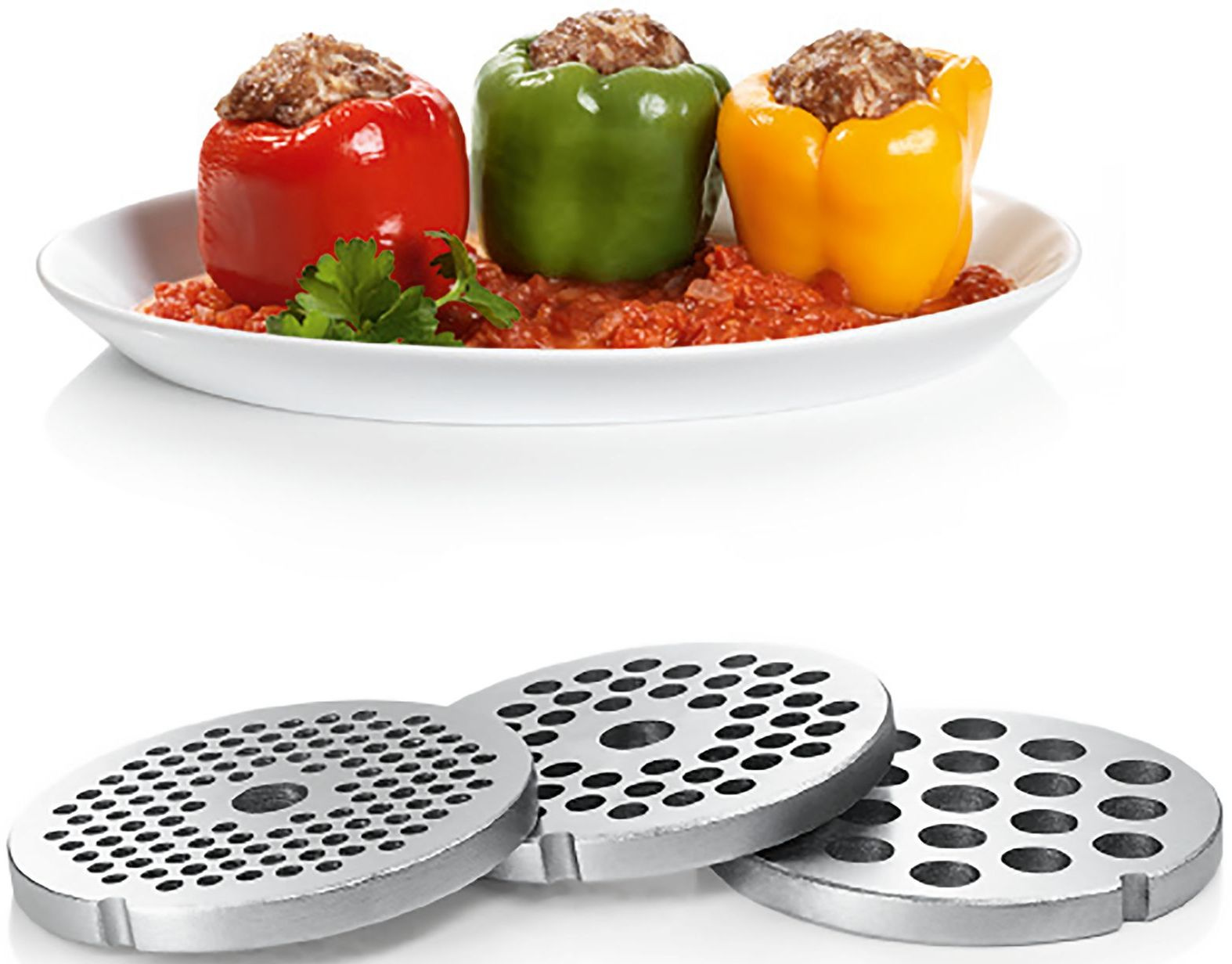 Насадка для шинковки и резки, 2 барабана. Насадка для кеббе. Насадка для колбас. Размер отверстий формовочных дисков: 3/ 4,8 / 8 мм.