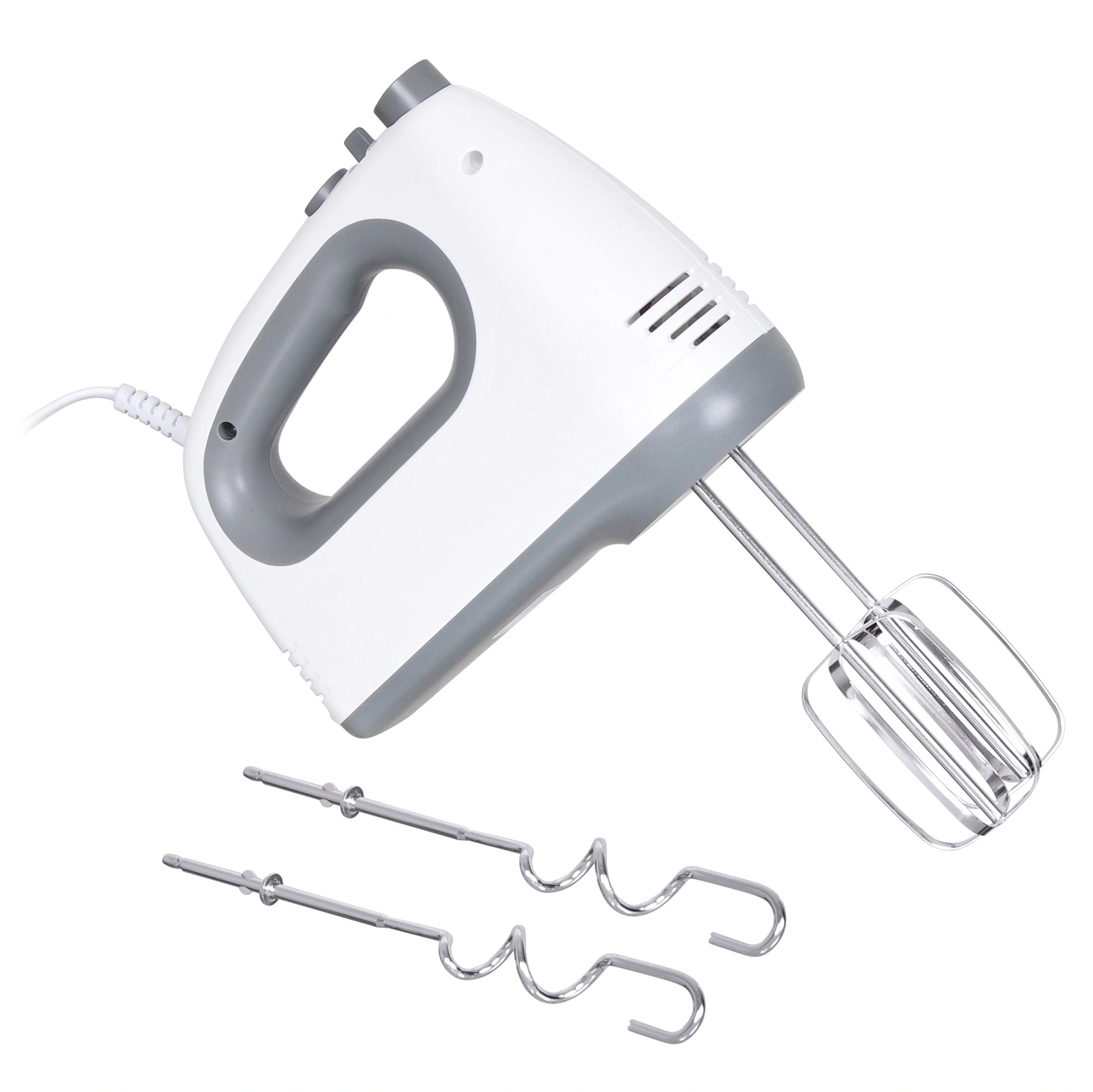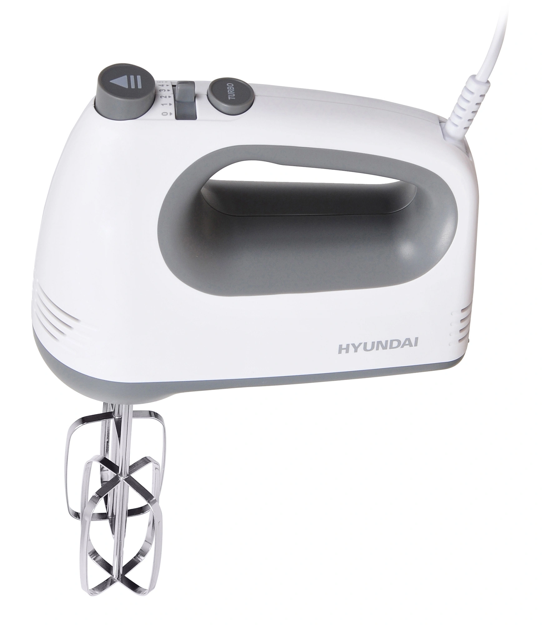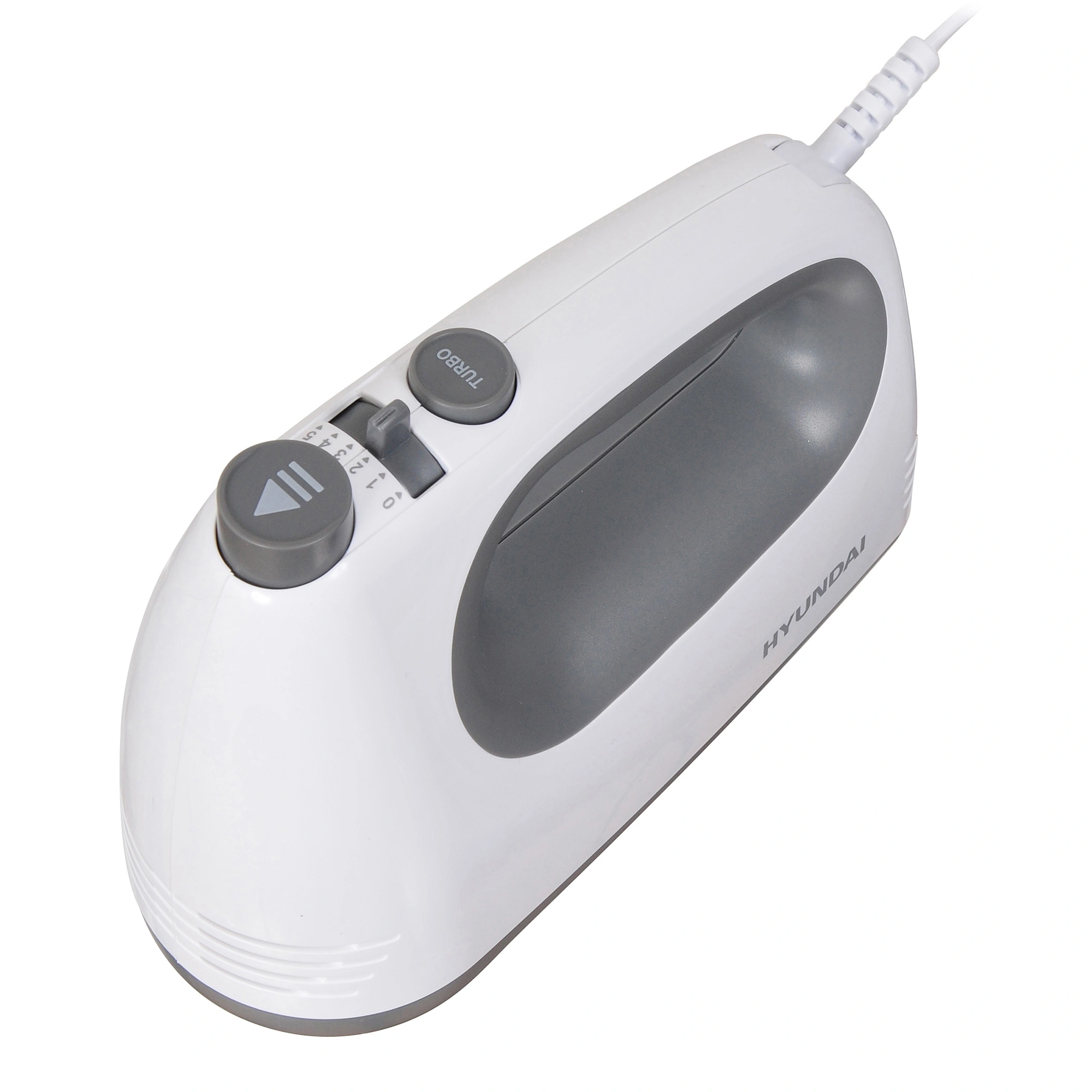 Миксер Hyundai HYM-H4501 – легкая и компактная модель, выполненная из качественного пластика, устойчивого к механическим воздействиям. Его очень удобно держать в руке, он не издает много шума в процессе работы. Форма ручки повторяет анатомию руки, есть углубление под указательный палец для осуществления удобного хвата. Переключатель скоростей расположен сверху, достаточно мягкий, но для переключения требуется минимальное усилие, чтобы не нажать случайно. Рядом есть кнопка турбо, помогающая увеличить скорость на 20 %. Этот режим позволяет качественно промешать продукты. Кнопка сброса венчиков активна только на нулевой отметке скорости. При других положениях она заблокирована. Это обеспечивает безопасность. Венчики выполнены из металла, достаточно прочные. Предназначены для жидкой консистенции и более густой. Вставляются достаточно легко, до щелчка. Шнур средней длины, сверху имеет усиленную защиту от скручивания.