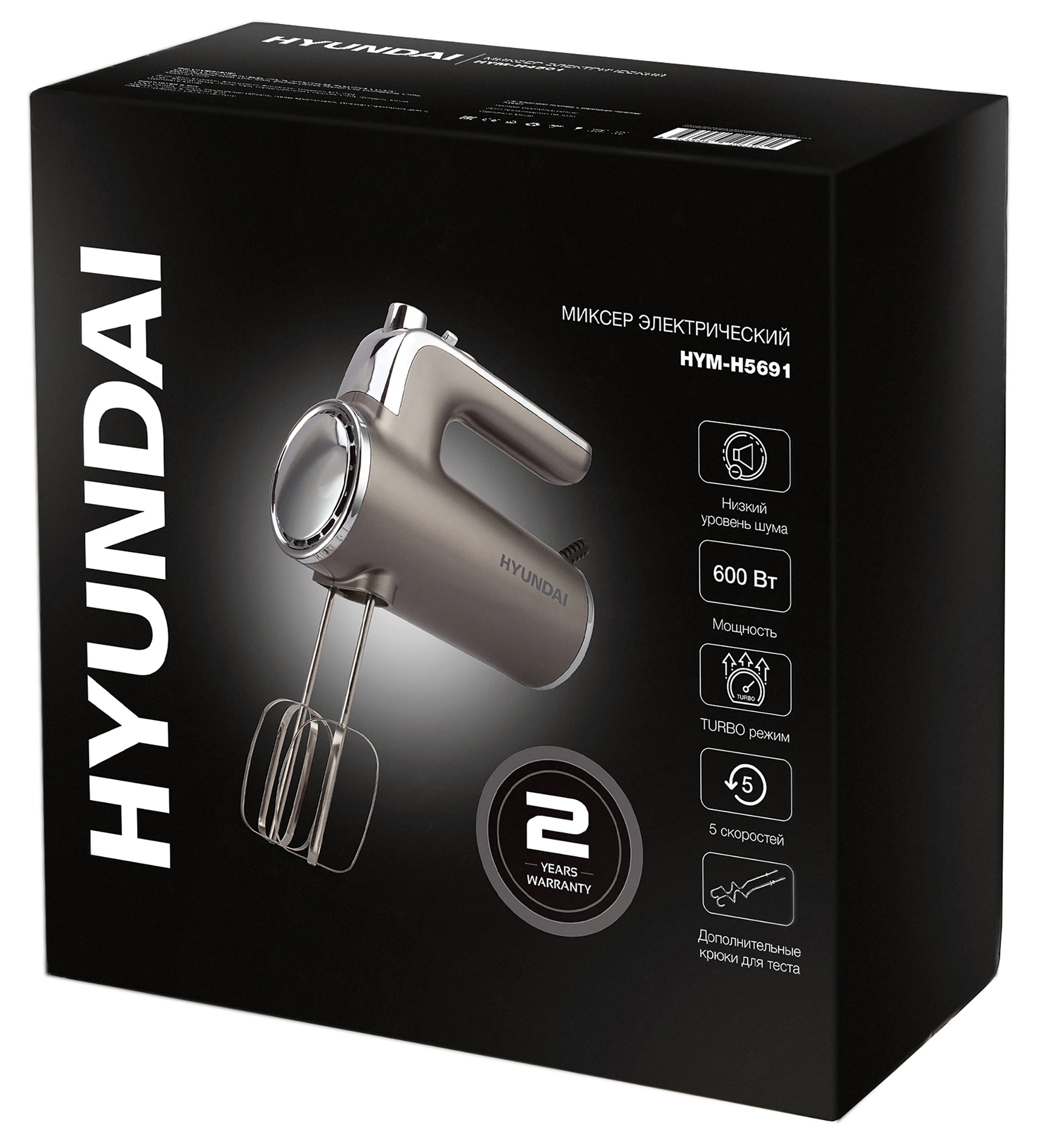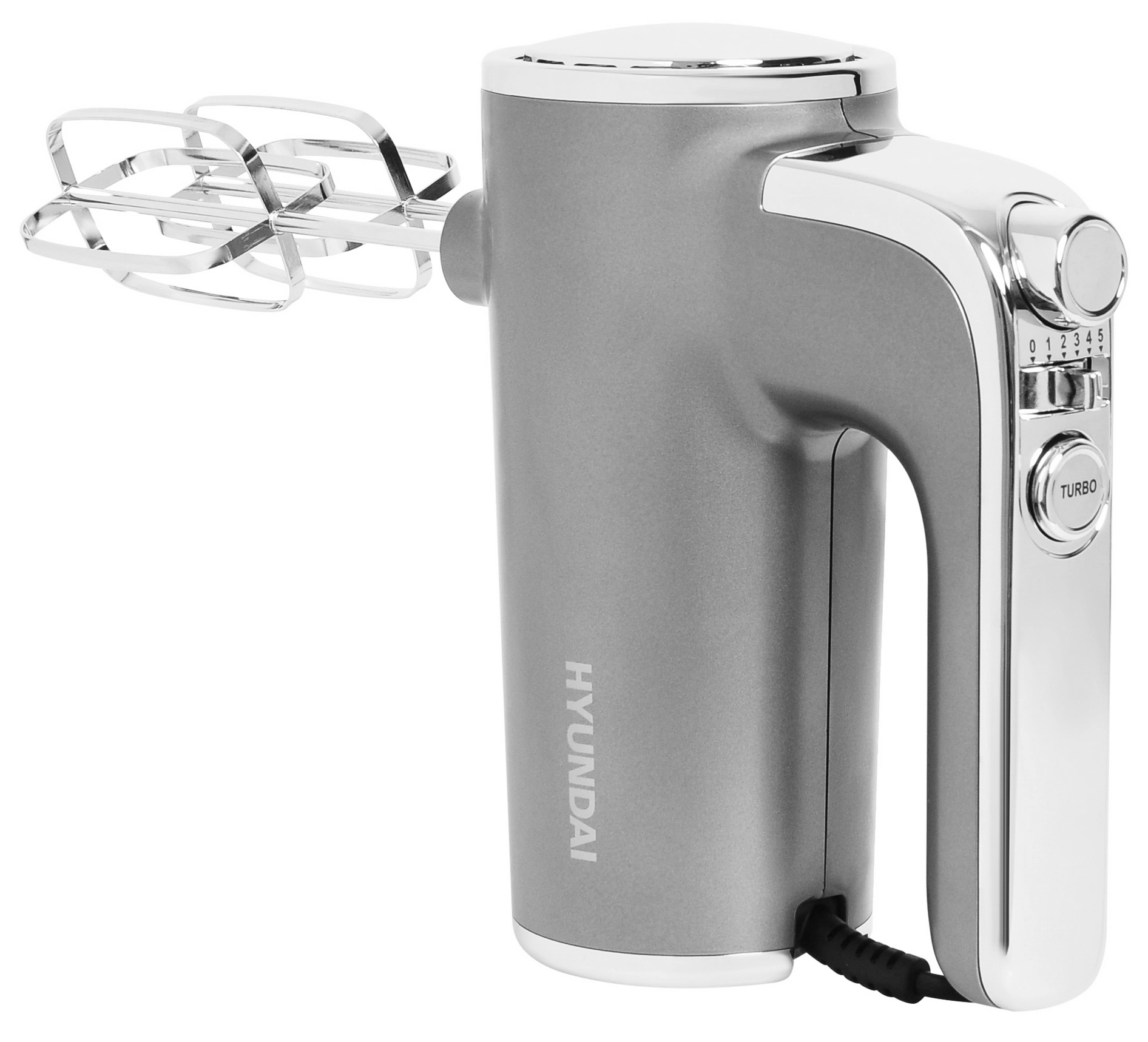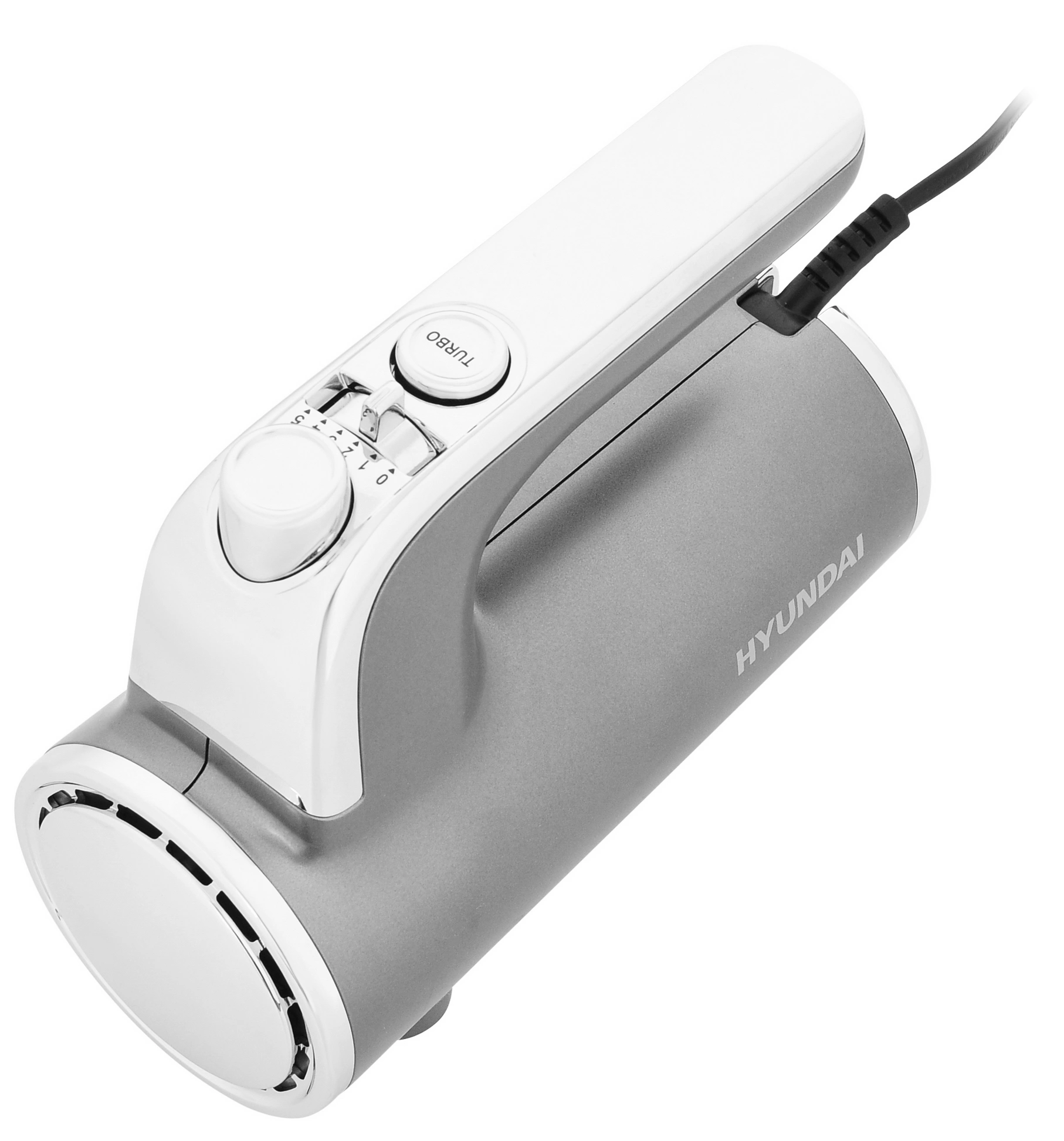 Миксер Hyundai HYM-H5691 отличается современным и стильным дизайном. Корпус состоит из основной части, имеющей форму цилиндра, и ручки, за которую очень удобно держать прибор в руках. Покрытие гладкое, легко протирается, на нем не остается следов. Дизайн выполнен в серебристом цвете, который выгодно подчеркивает стилистическое решение. С помощью этого устройства можно легко и быстро приготовить тесто, омлет, крем, соус или коктейль. Для каждой задачи рекомендован свой режим. Его можно выбрать при помощи механического переключателя. Режим турбо на короткое время добавит мощность при любой скорости. Всего их пять. Насадки очень легко устанавливаются. При этом их достаточно поставить на штатное место и слегка нажать. Чтобы вынуть венчики, необходимо воспользоваться специальной кнопкой, которая обеспечивает отщелкивание. Такая функция доступна только в нулевом положении. Во всех остальных случаях кнопка заблокирована. Это удобно для обеспечения безопасности при эксплуатации.