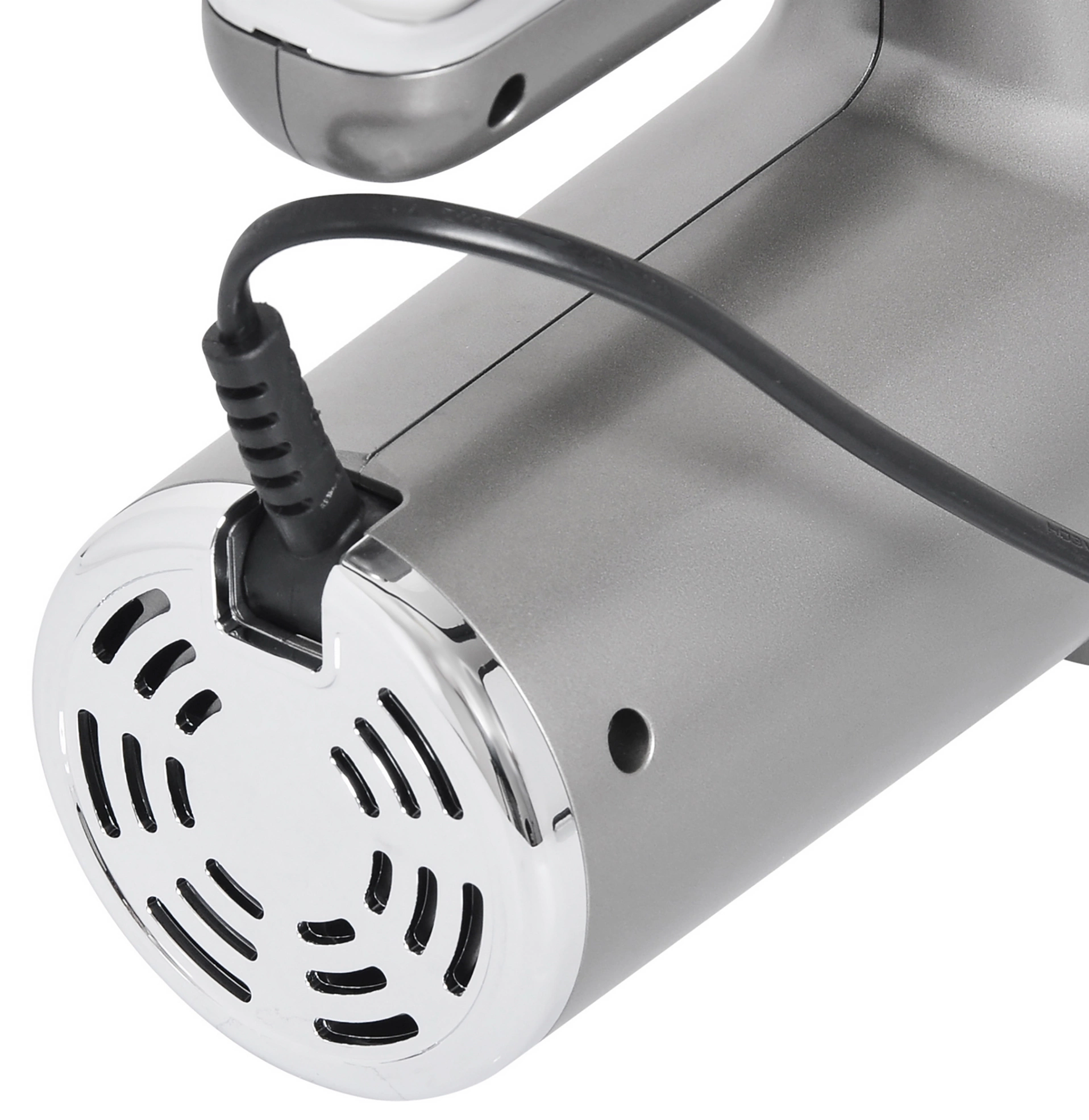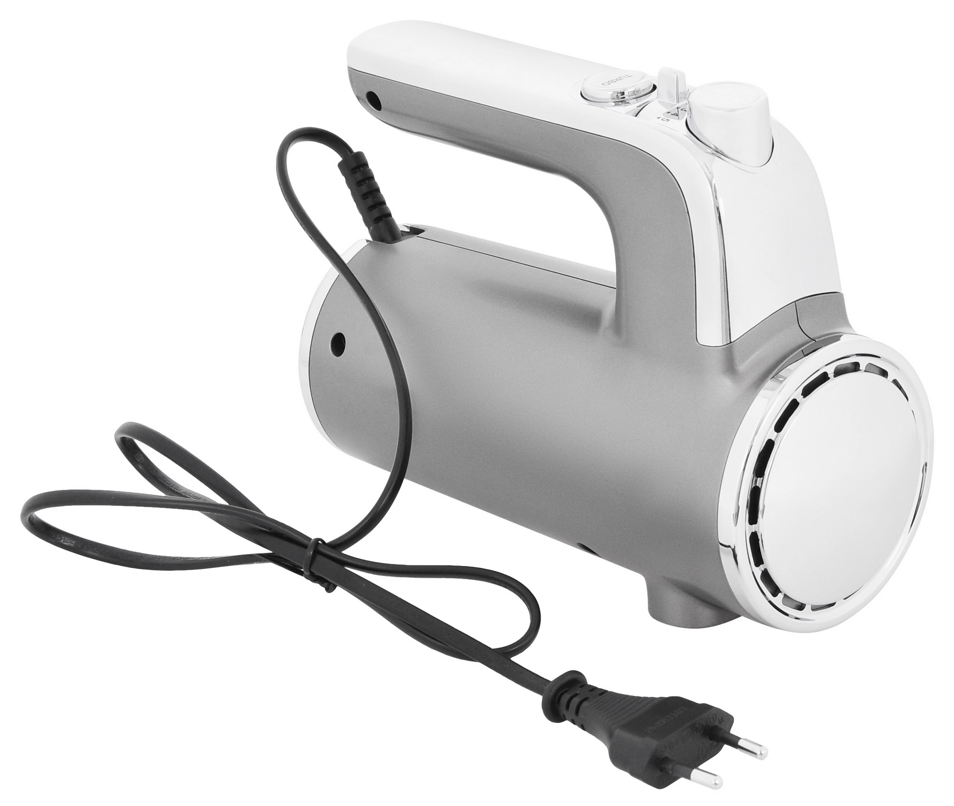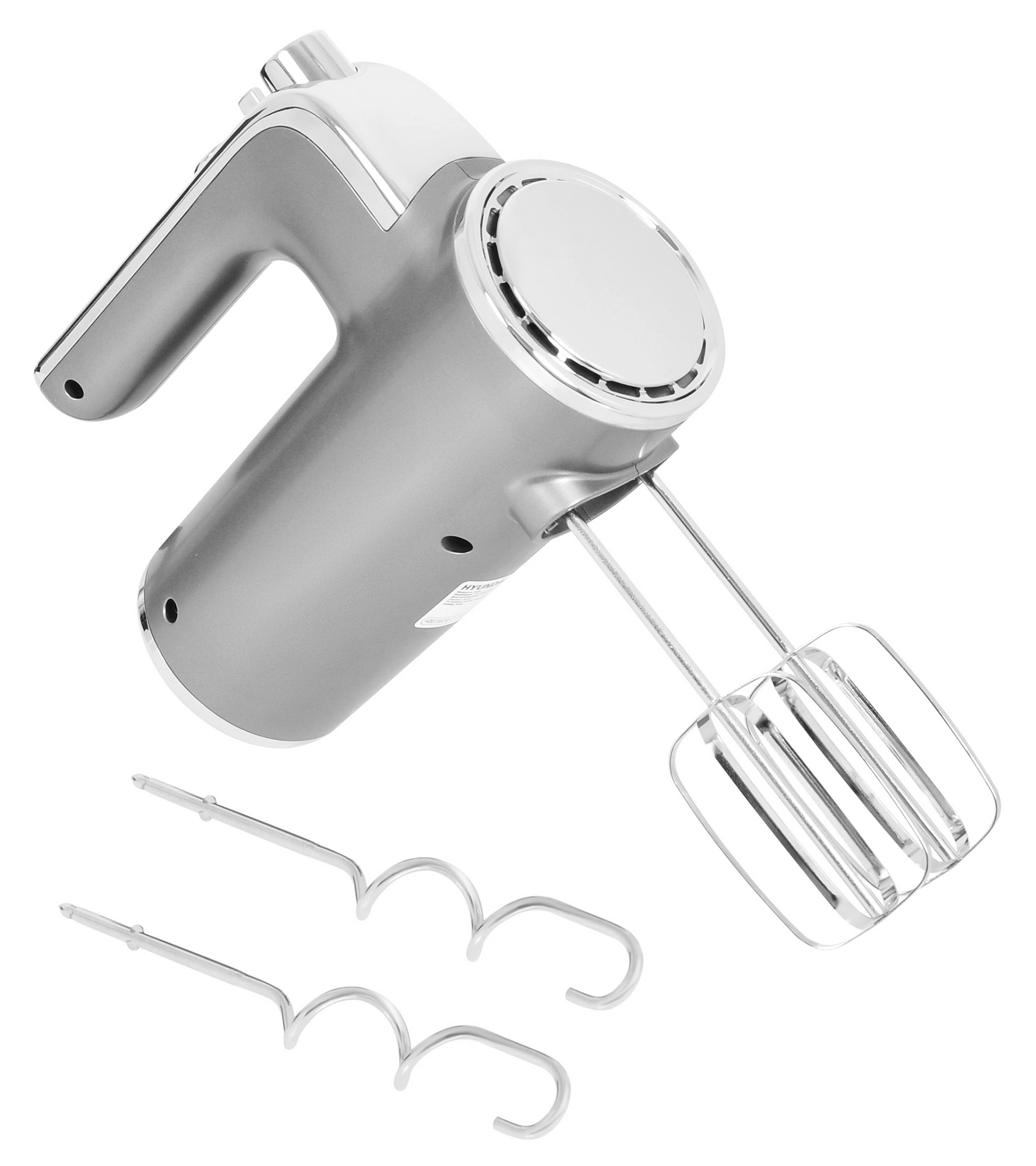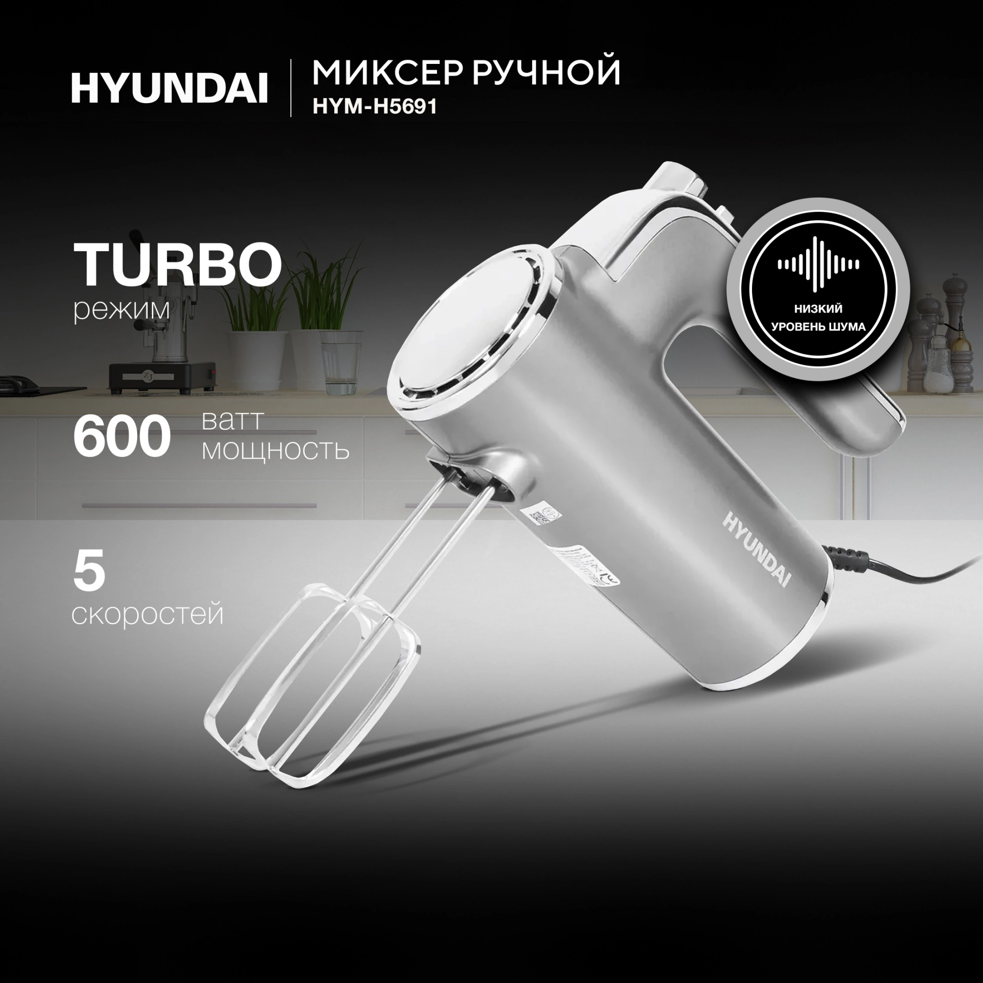 Миксер Hyundai HYM-H5691 отличается современным и стильным дизайном. Корпус состоит из основной части, имеющей форму цилиндра, и ручки, за которую очень удобно держать прибор в руках. Покрытие гладкое, легко протирается, на нем не остается следов. Дизайн выполнен в серебристом цвете, который выгодно подчеркивает стилистическое решение. С помощью этого устройства можно легко и быстро приготовить тесто, омлет, крем, соус или коктейль. Для каждой задачи рекомендован свой режим. Его можно выбрать при помощи механического переключателя. Режим турбо на короткое время добавит мощность при любой скорости. Всего их пять. Насадки очень легко устанавливаются. При этом их достаточно поставить на штатное место и слегка нажать. Чтобы вынуть венчики, необходимо воспользоваться специальной кнопкой, которая обеспечивает отщелкивание. Такая функция доступна только в нулевом положении. Во всех остальных случаях кнопка заблокирована. Это удобно для обеспечения безопасности при эксплуатации.