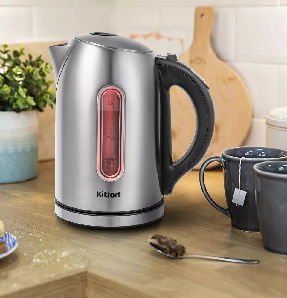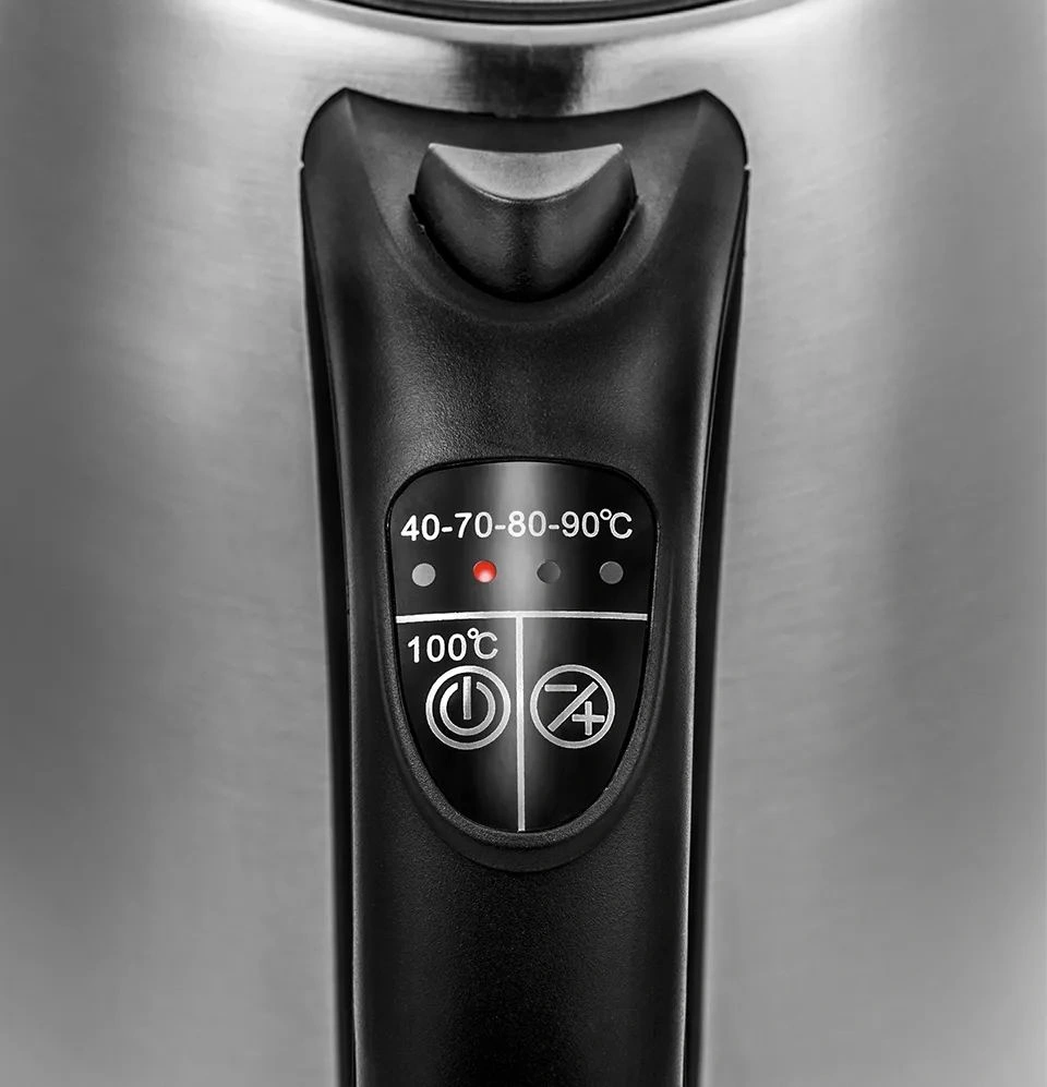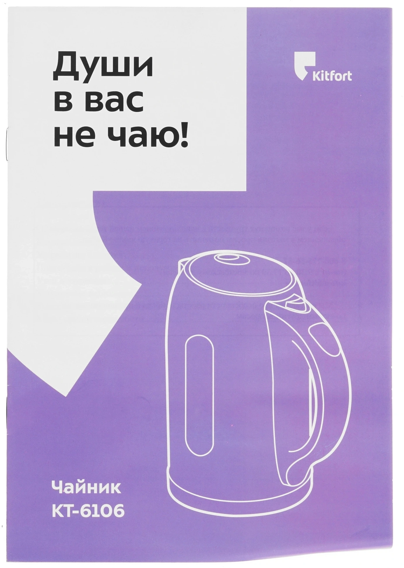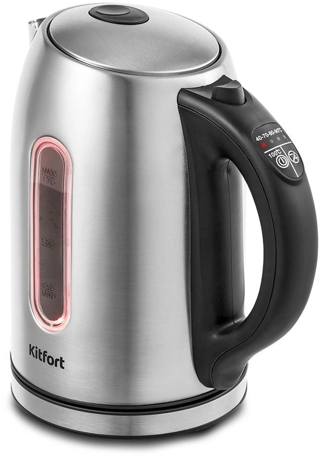 Чайник Kitfort КТ-6106 выполнен в стильном металлическом корпусе. Ручка чайника пластиковая, не нагревается и удобно лежит в руке. Для вашего удобства на ручке расположена панель управления чайником.