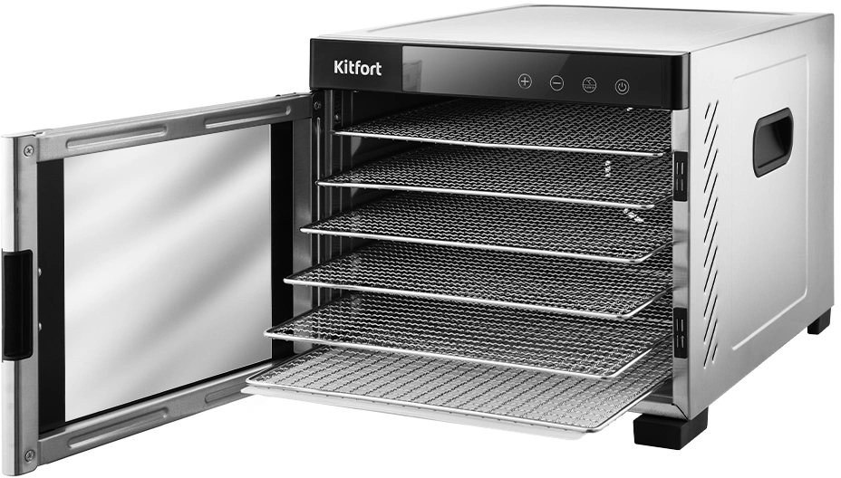Сушилка имеет в комплекте 6 поддонов из нержавеющей стали, 6 поддонов для жидкости и 6 сеток для мелких продуктов.