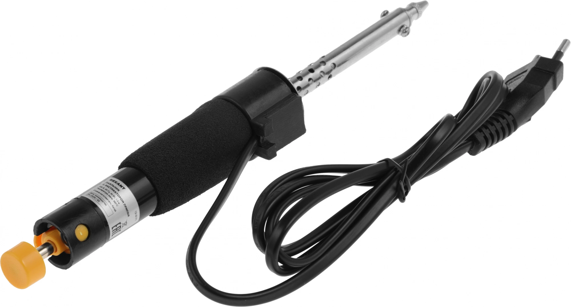 Паяльник со встроенным вакуумным отсосом позволяет монтировать радиоэлементы и одновременно собирать с поверхности платы лишний расплавленный припой, что заметно ускоряет пайку. Механизм работает по принципу шприца: пружина выталкивает поршень из камеры устройства, создавая отрицательное давление.