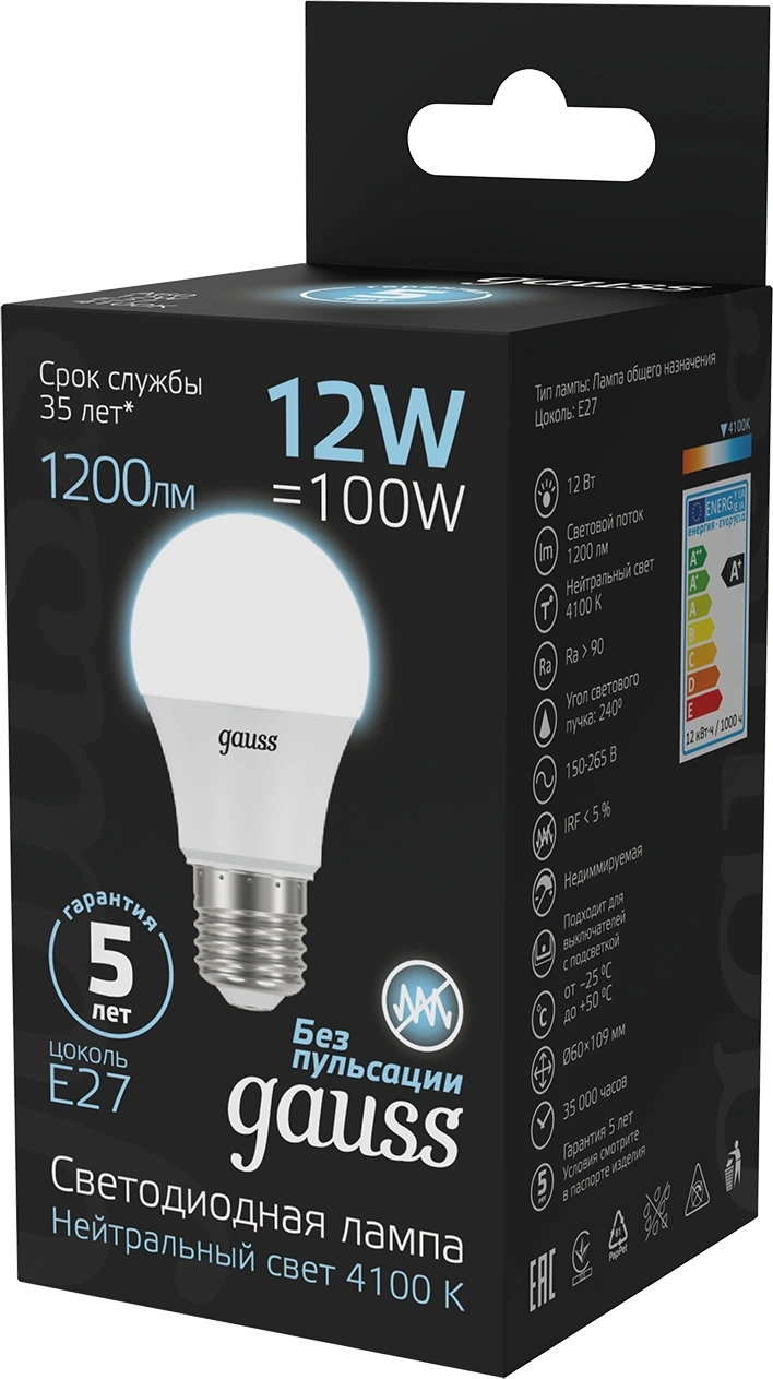 Светодиодная лампа Gauss - самый безопасный для здоровья и окружающей среды источник света. Она не пульсирует, мгновенно включается, не содержит ртути, и имеет больший срок службы, чем лампы накаливания и КЛЛ.