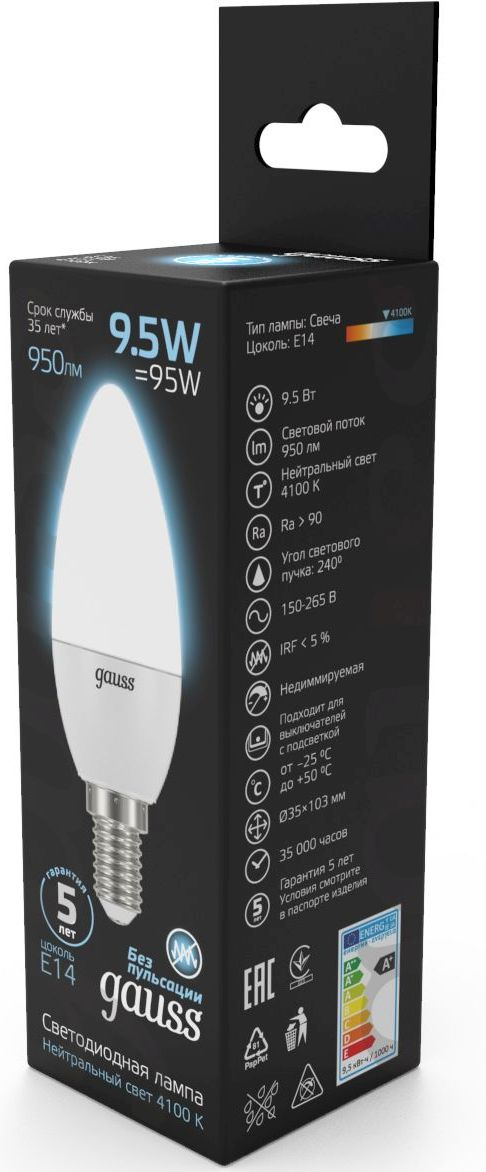 Светодиодная лампа Gauss - самый безопасный для здоровья и окружающей среды источник света. Она не пульсирует, мгновенно включается, не содержит ртути, и имеет больший срок службы, чем лампы накаливания и КЛЛ.