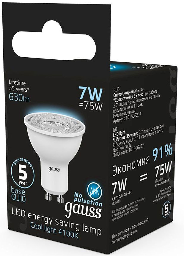 Светодиодная лампа Gauss - самый безопасный для здоровья и окружающей среды источник света. Она не пульсирует, мгновенно включается, не содержит ртути, и имеет больший срок службы, чем лампы накаливания и КЛЛ.