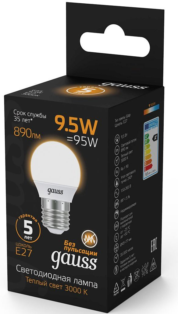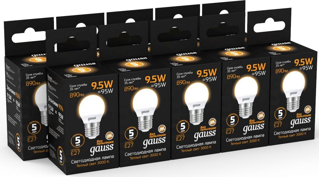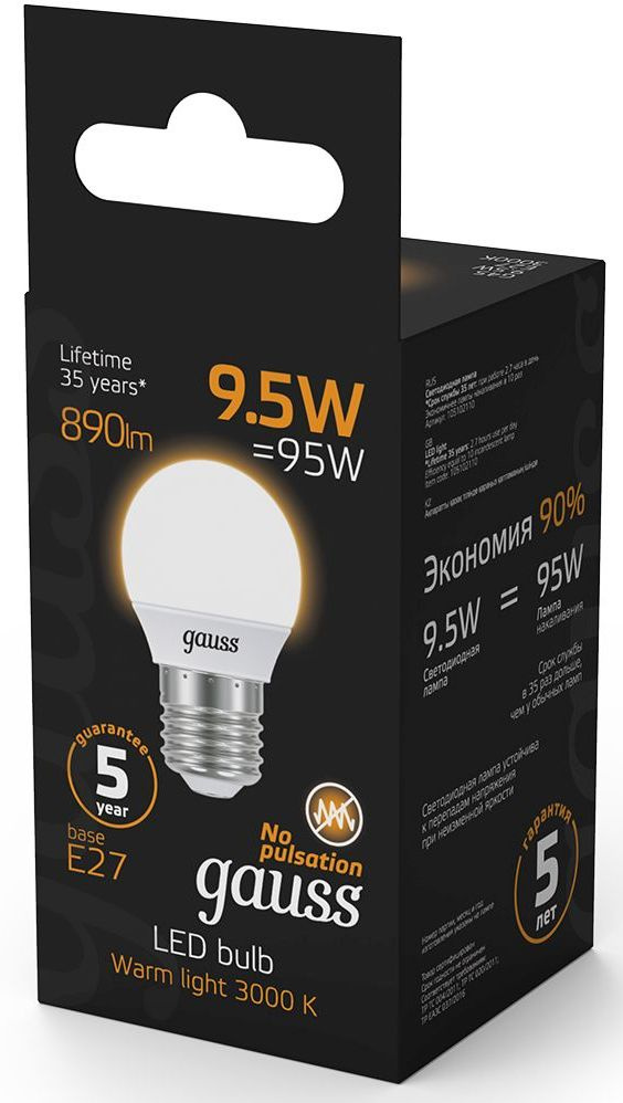 Светодиодная лампа Gauss - самый безопасный для здоровья и окружающей среды источник света. Она не пульсирует, мгновенно включается, не содержит ртути, и имеет больший срок службы, чем лампы накаливания и КЛЛ.
