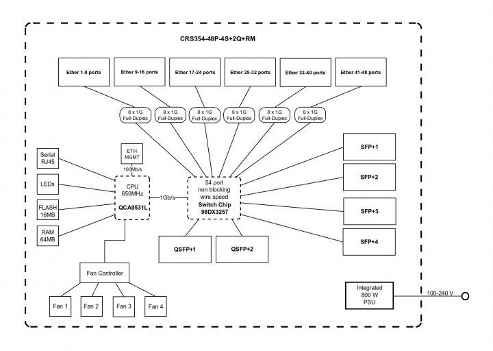 2 порта 40G QSFP+; процессор одноядерный QCA9531 с частотой 650 МГц; в комплекте: кабель питания, монтажные уголки для установки в стойку (2 шт.), монтажные уголки для крепления в стойку сзади (2 шт.), держатель для организации кабелей, набор винтов (K-68)