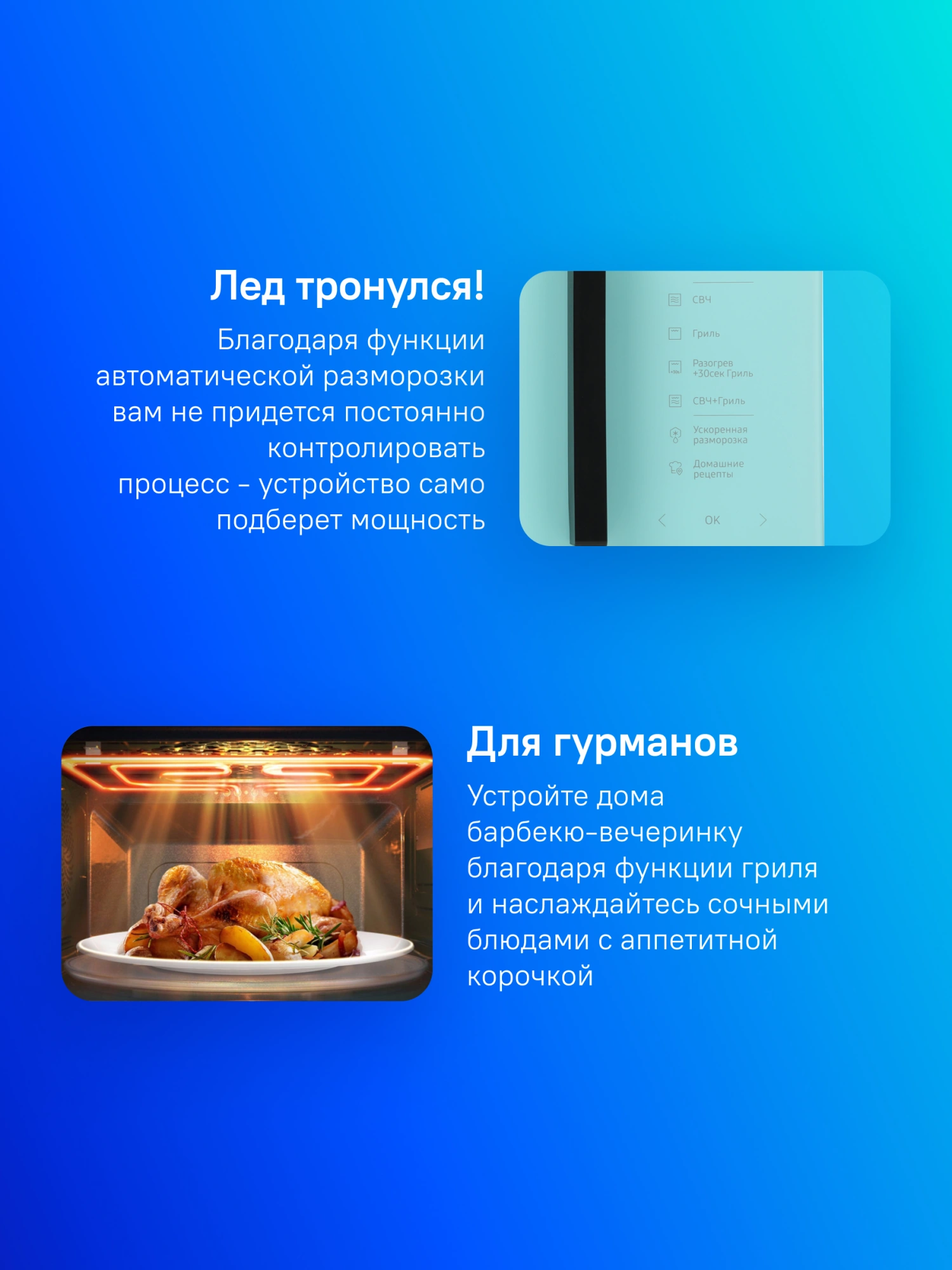 автоматическая разморозка, автоматическое приготовление, гриль