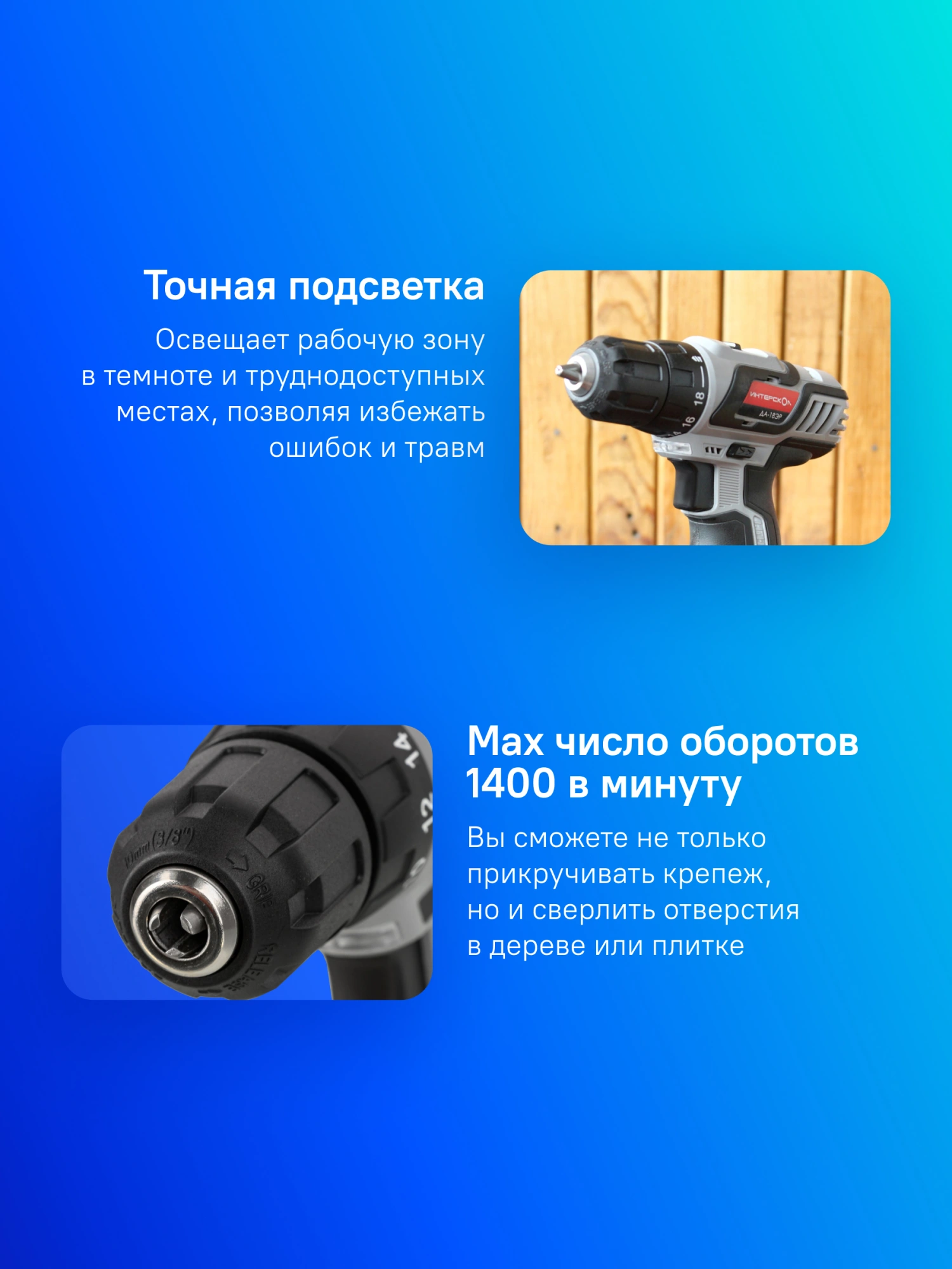 Двухскоростной редуктор с металлическими шестернями – высокая эффективность как сверления, так и закручивания крепежа, Компактный, с укороченной базой, с автолоком шпинделя, оснащен бесключевым одномуфтовым патроном на 10 мм.