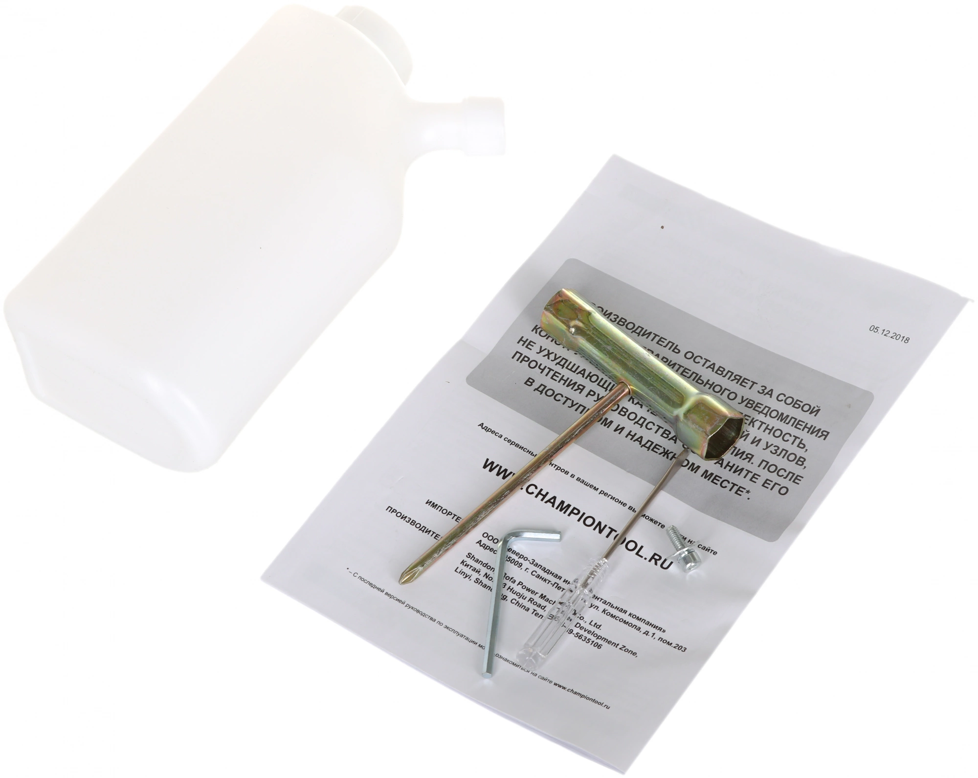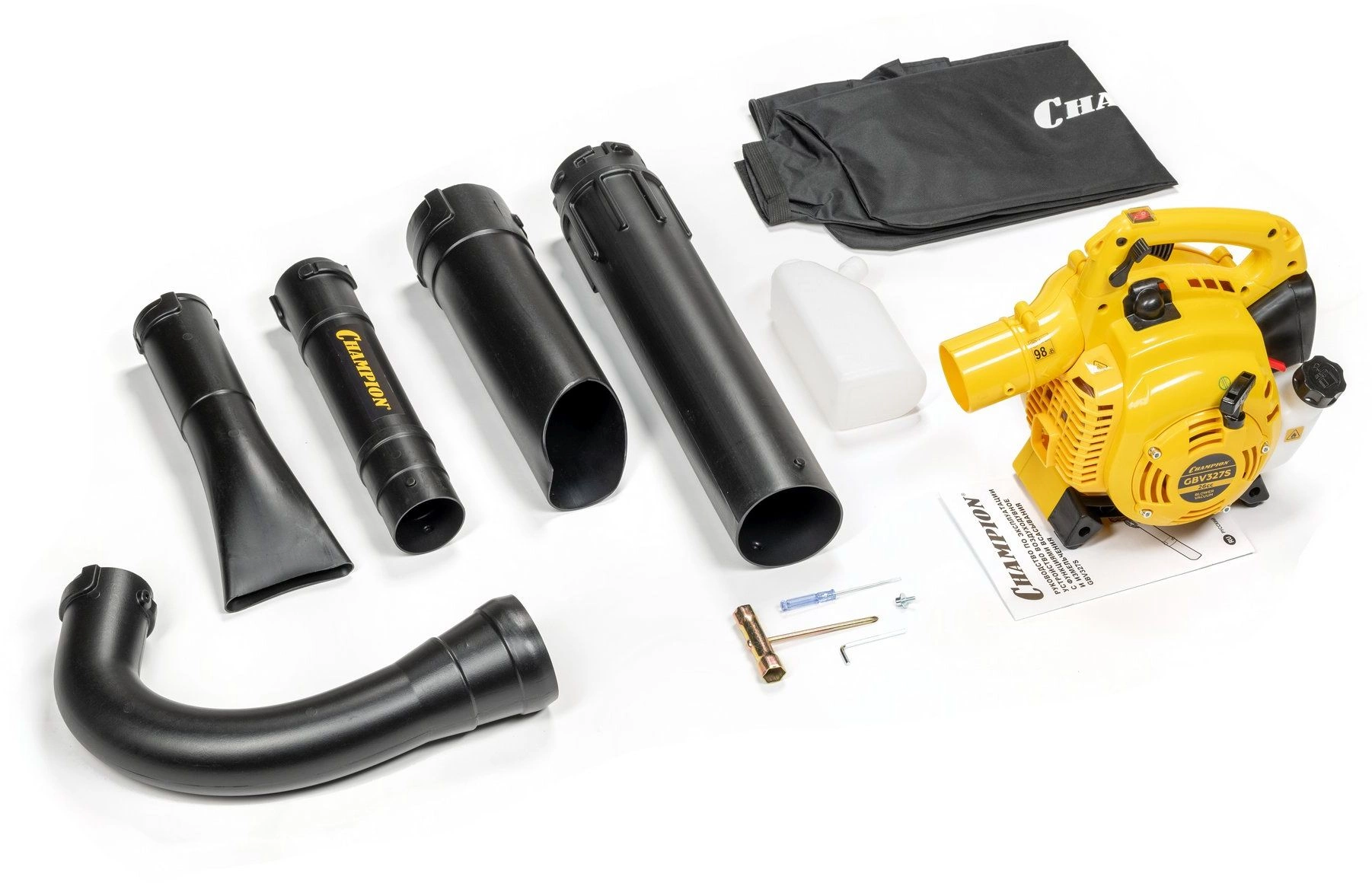 Воздуходувка-измельчитель; трубы напорные - 4 шт.; труба разгрузочная; мешок для сбора мусора; емкость для приготовления топливной смеси; отвертка; ключ шестигранный 4 мм; винт; ключ свечной; руководство по эксплуатации; коробка.