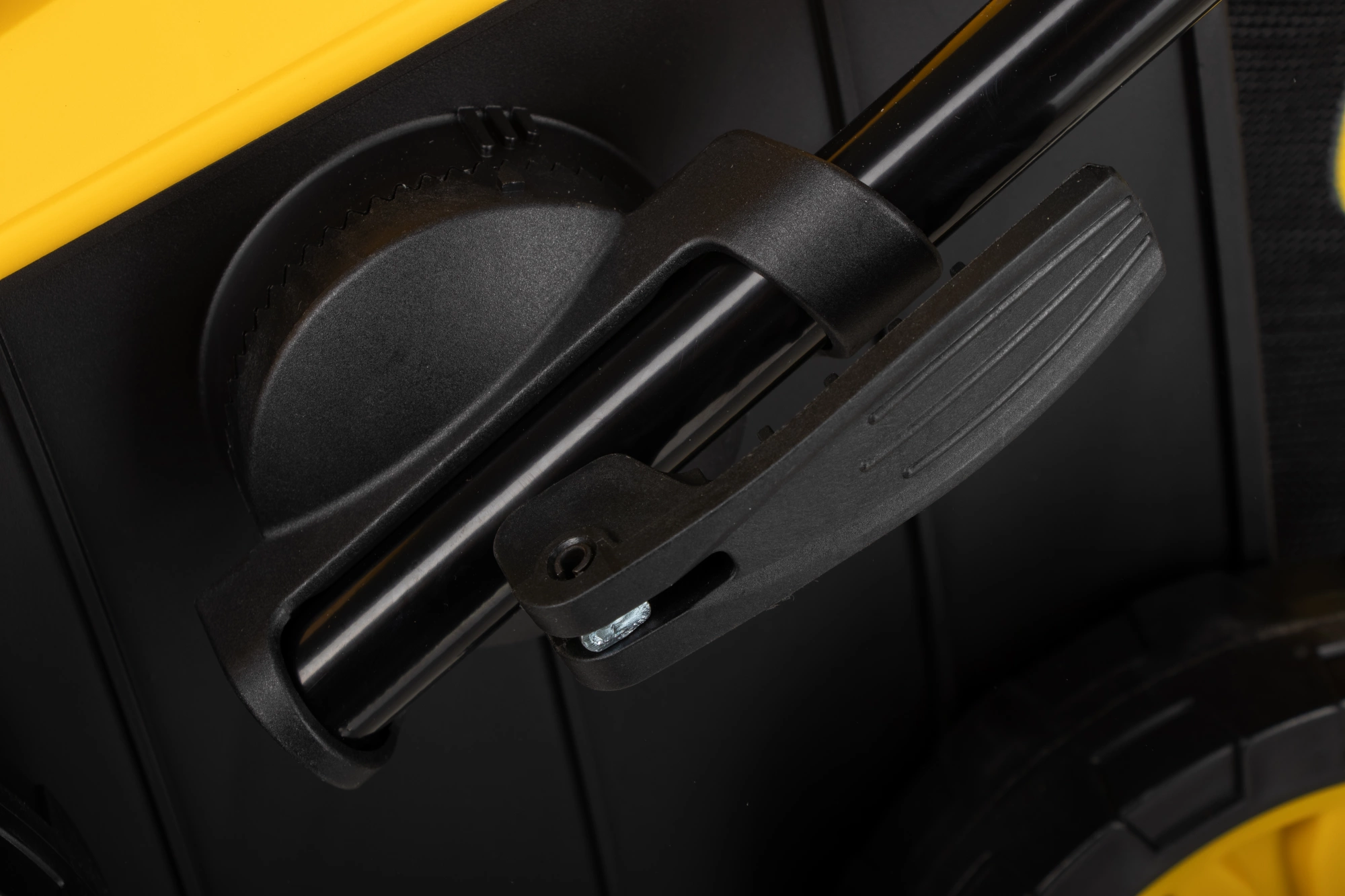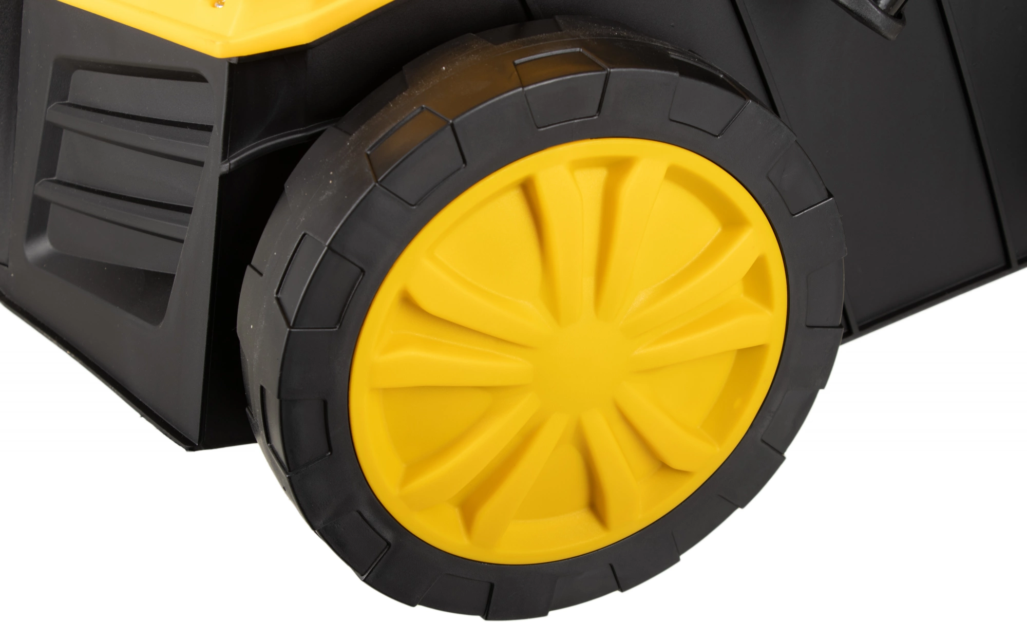 Большие колеса способствуют хорошей проходимости. Удобство управления. Основные органы управления вынесены на рукоятку, что обеспечивает комфорт во время использования. Вместительность - 55-литровый травосборник. Центральная регулировка. Регулировка глубины обработки производится с помощью рычага.