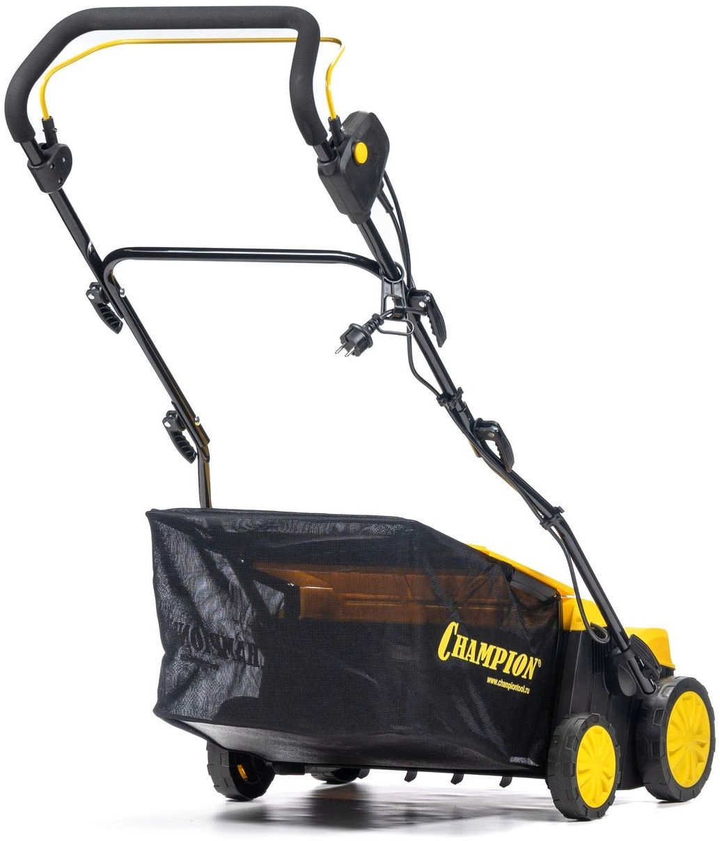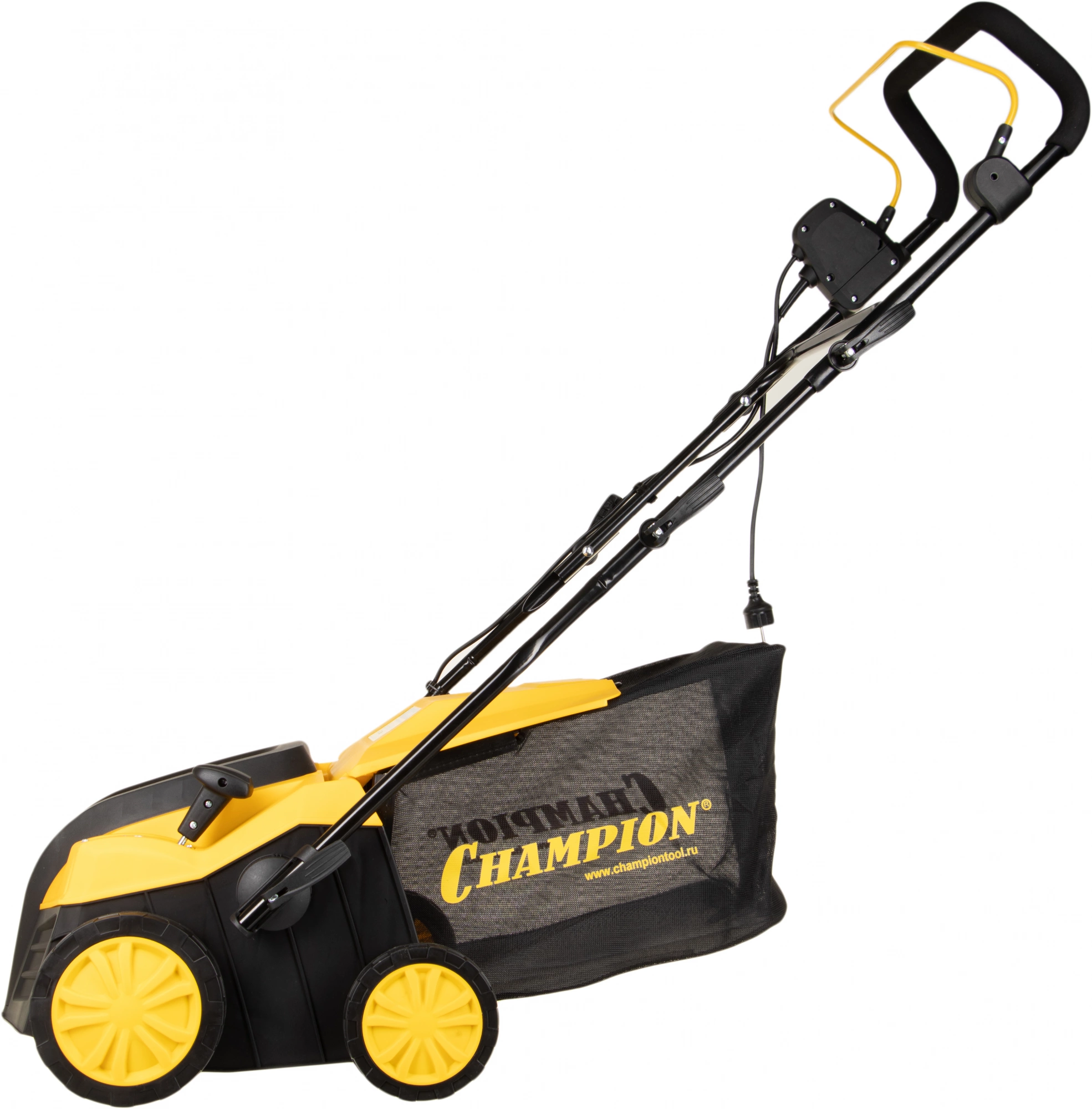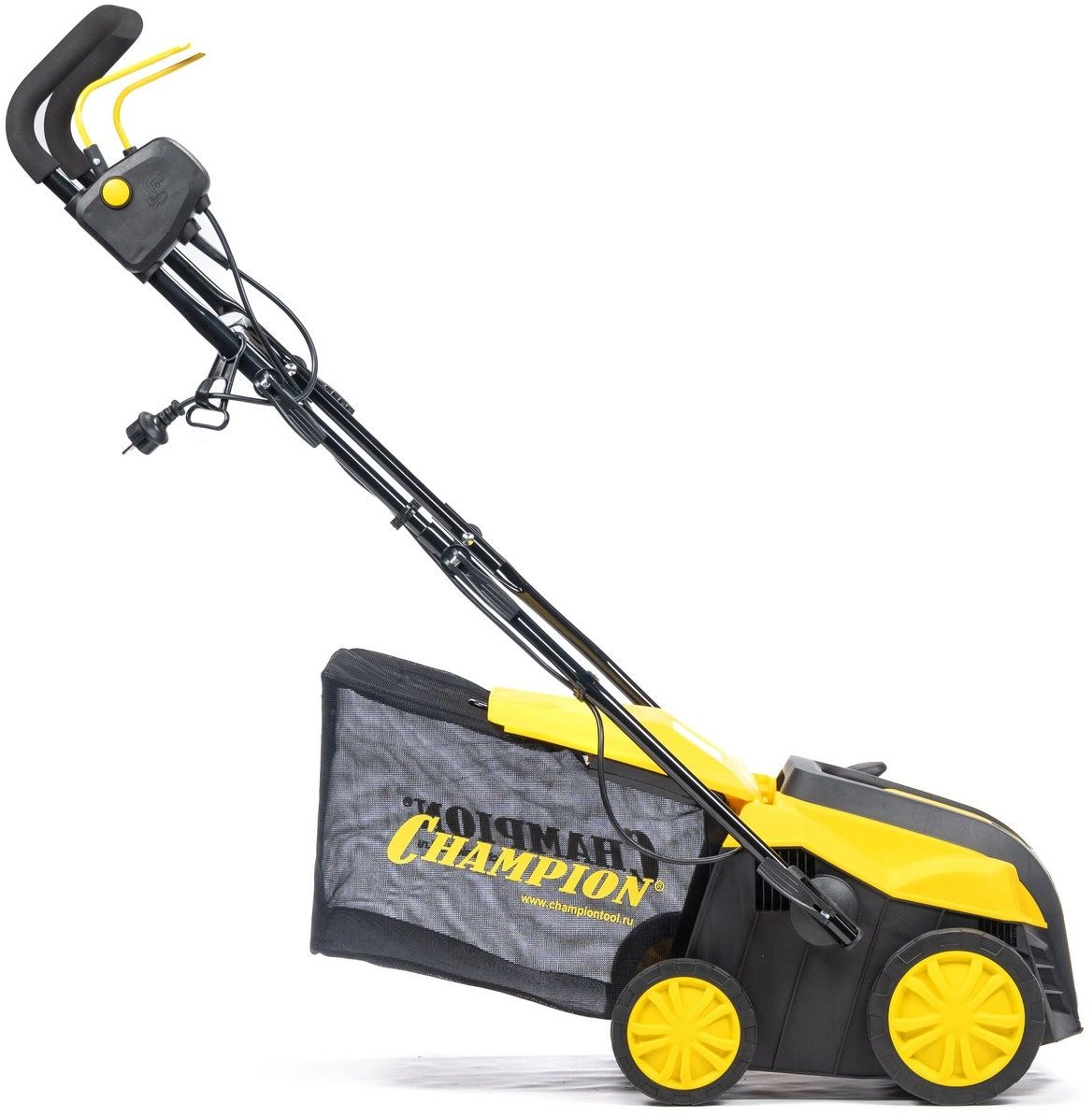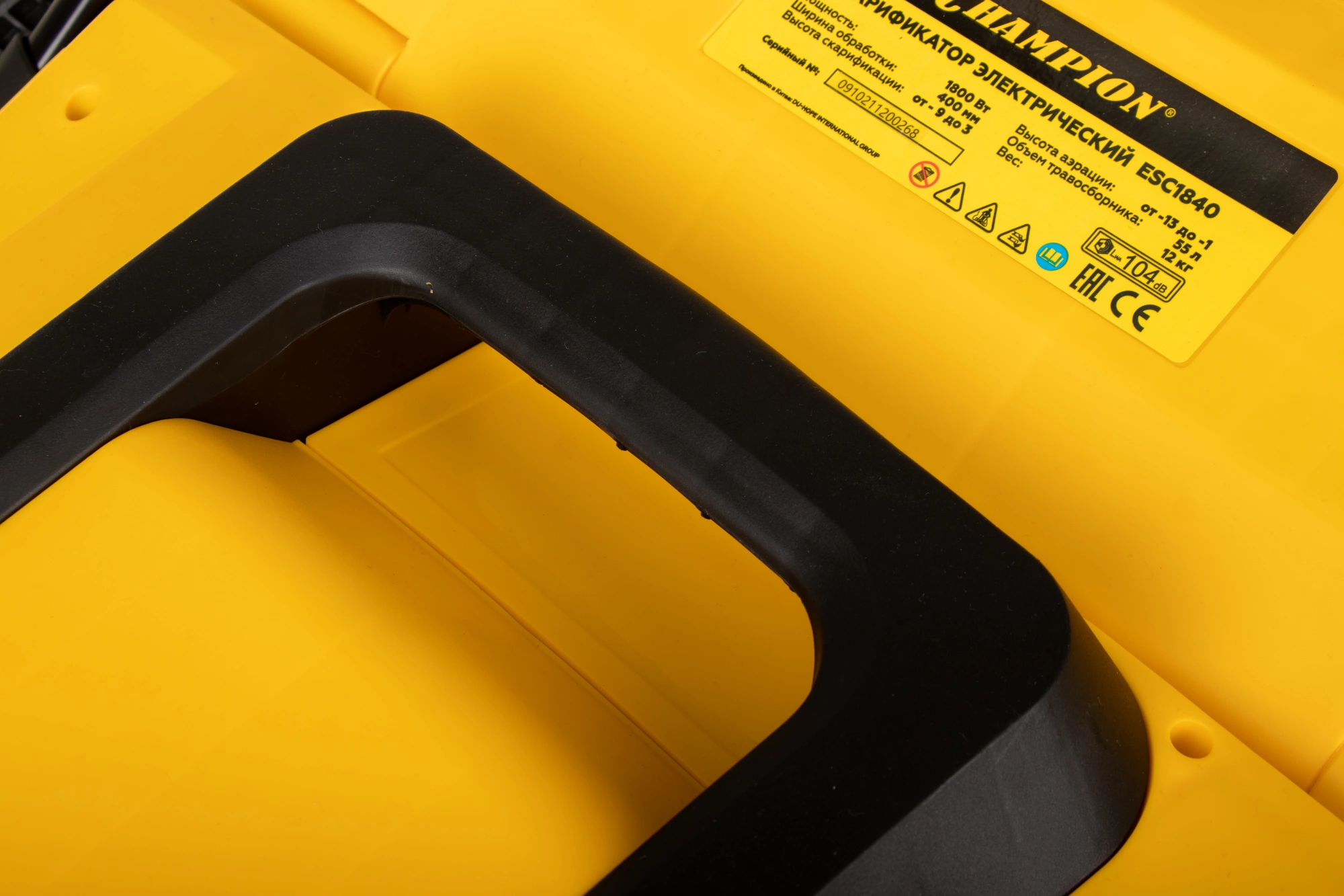 Champion ESC1840 имеет два сменных рабочих валика. Выполняет две функции: аэрацию почвы и скарификацию. Модель не выделяет выхлопных газов и отличается легкостью. Центральный рычаг имеет четыре положения для регулировки глубины обработки. Травосборник 55 л.