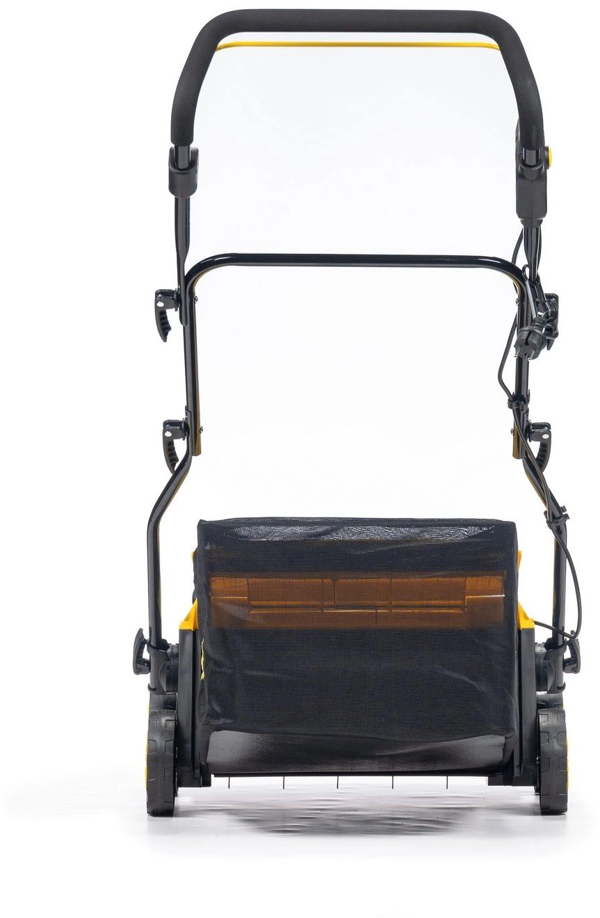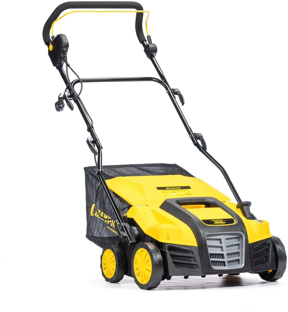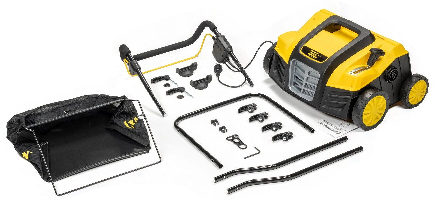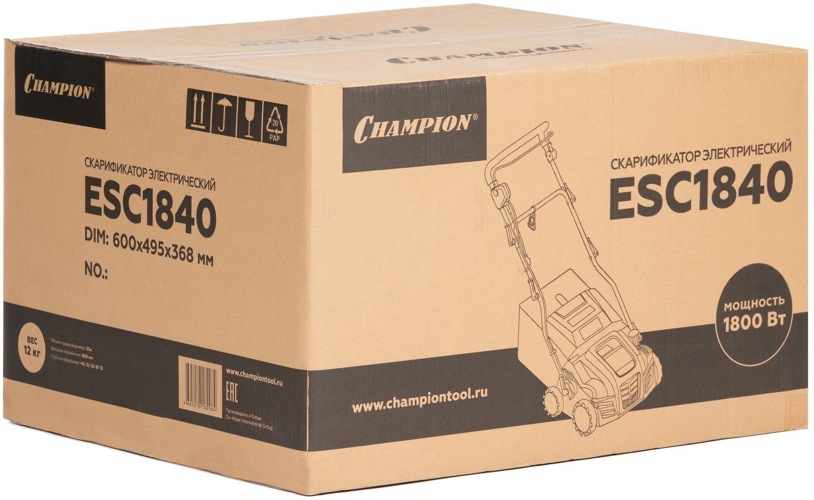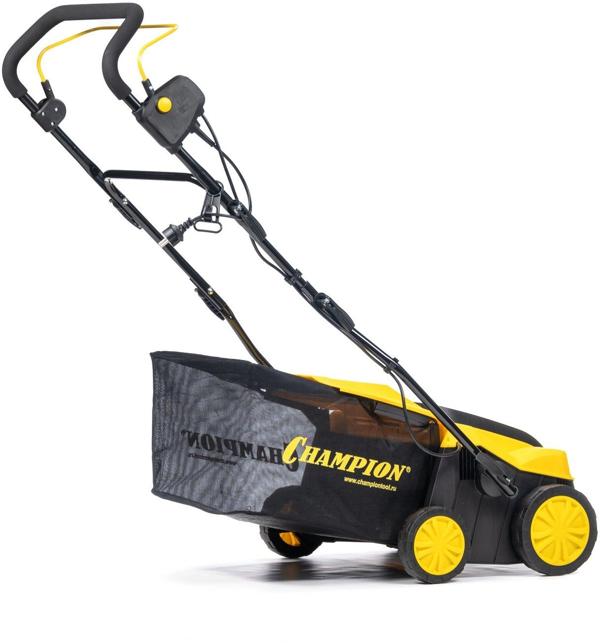 Champion ESC1840 имеет два сменных рабочих валика. Выполняет две функции: аэрацию почвы и скарификацию. Модель не выделяет выхлопных газов и отличается легкостью. Центральный рычаг имеет четыре положения для регулировки глубины обработки. Травосборник 55 л.