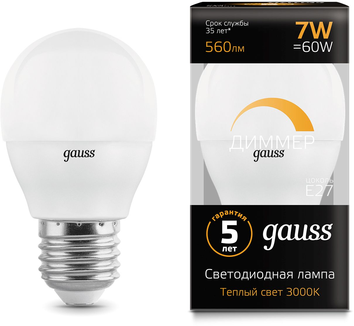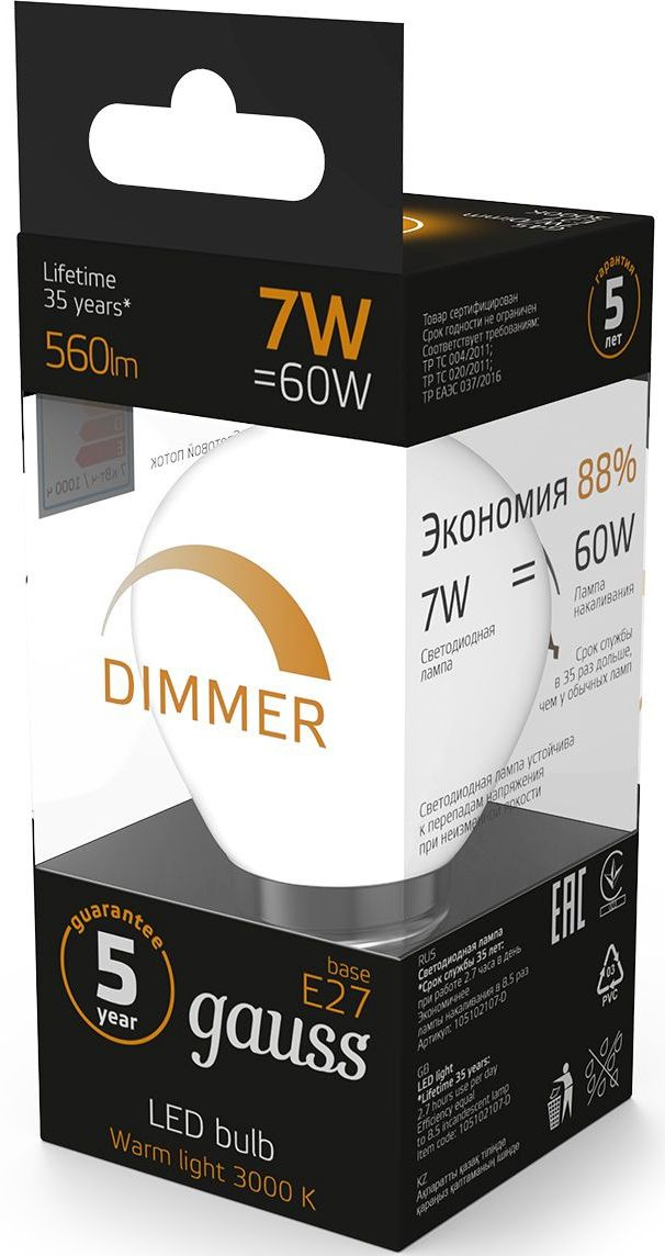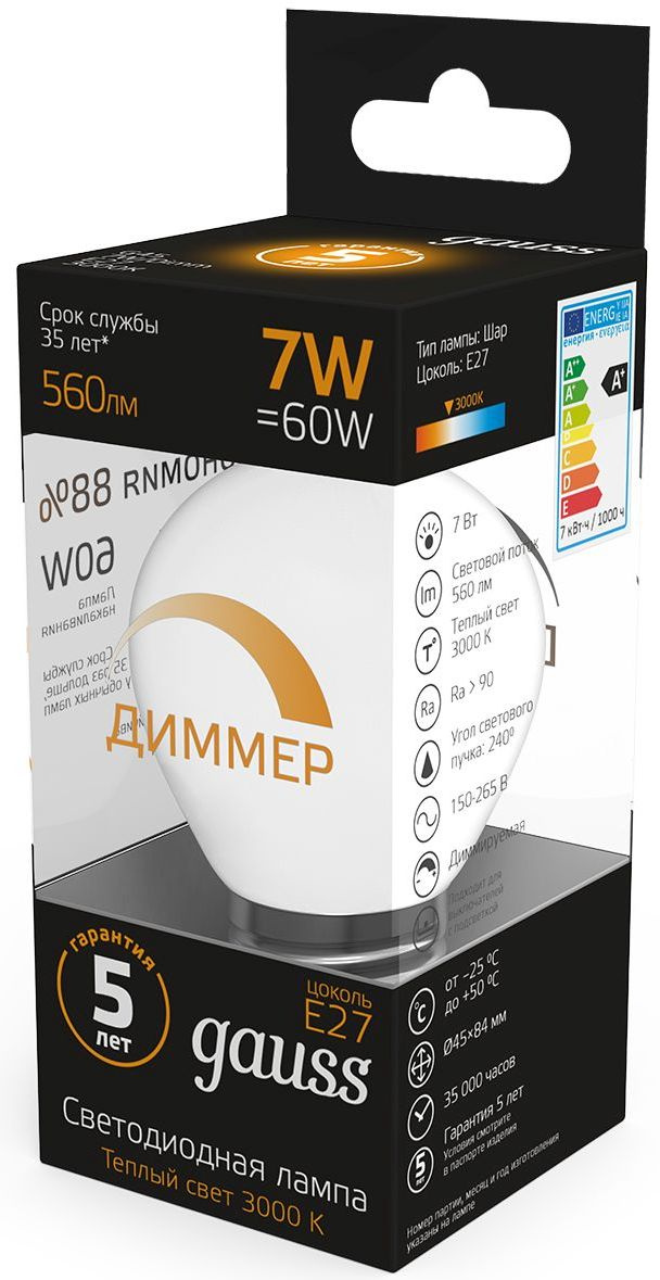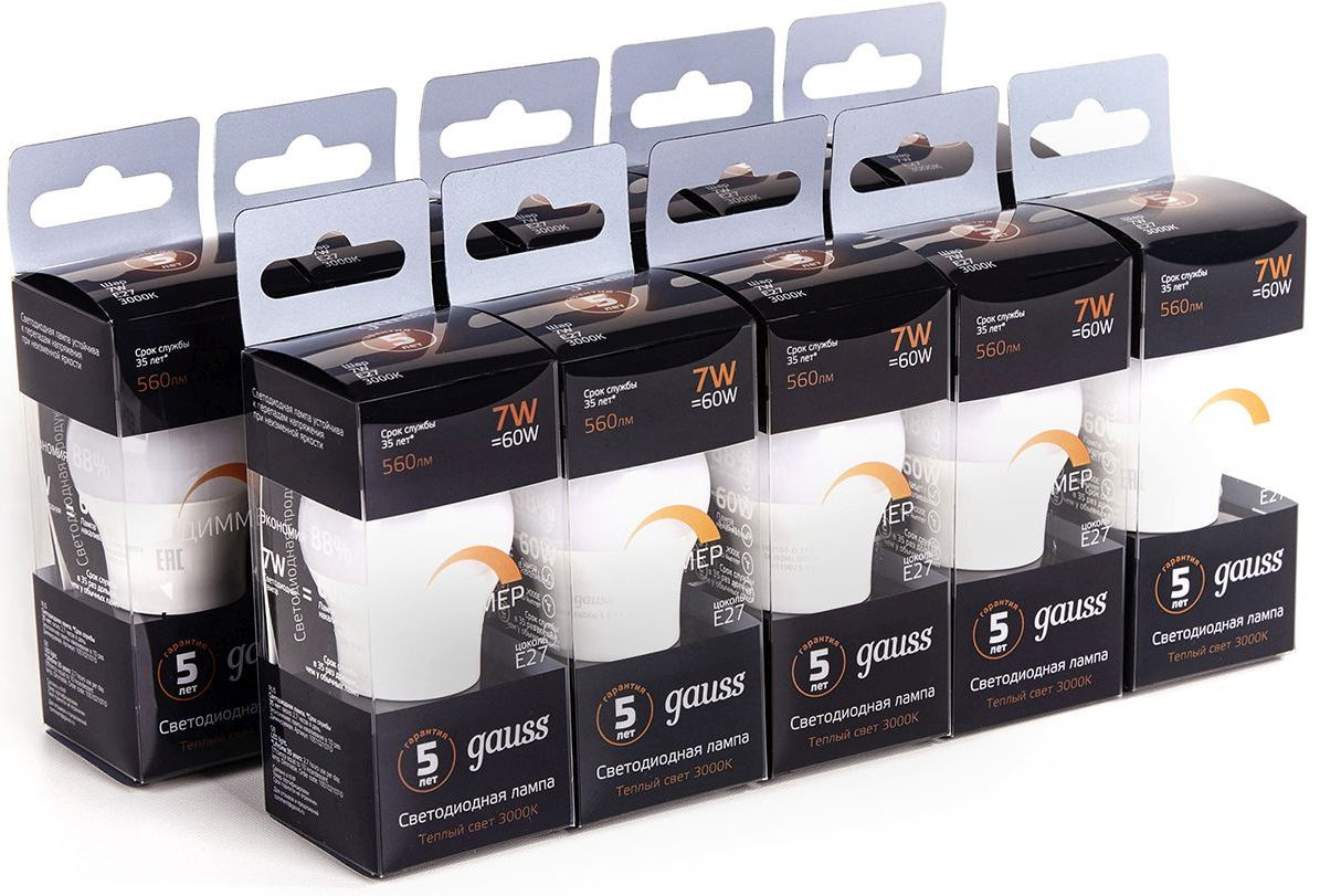 Лампа светодиодная Gauss 7Вт цок.:E27 шар 220B св.свеч.бел.теп. (упак.:10шт) (105102107-D)