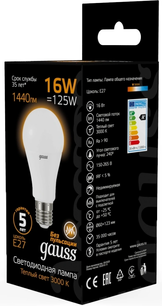 16Вт цок.:E27 груша 220B св.свеч.бел.теп. (упак.:...