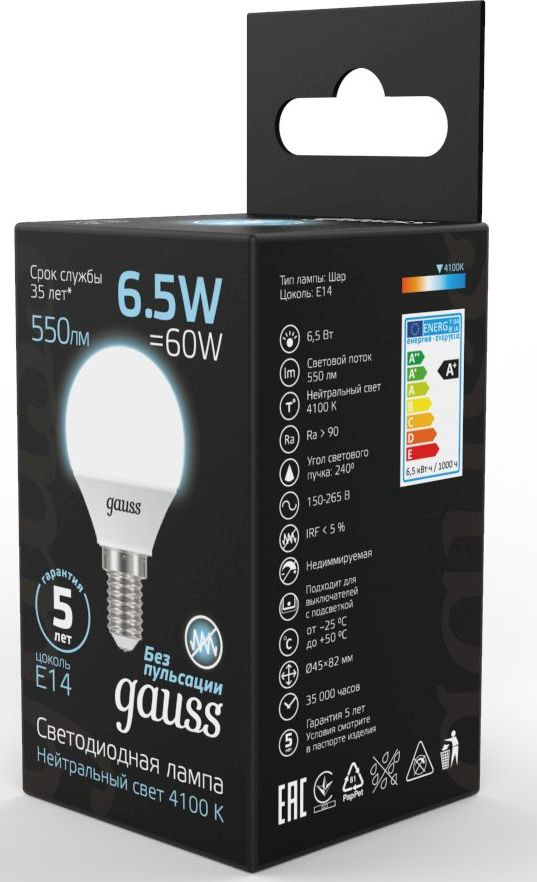 Лампа светодиодная Gauss 6.5Вт цок.:E14 шар 220B св.свеч.бел.нейт. (упак.:10шт) (105101207)
