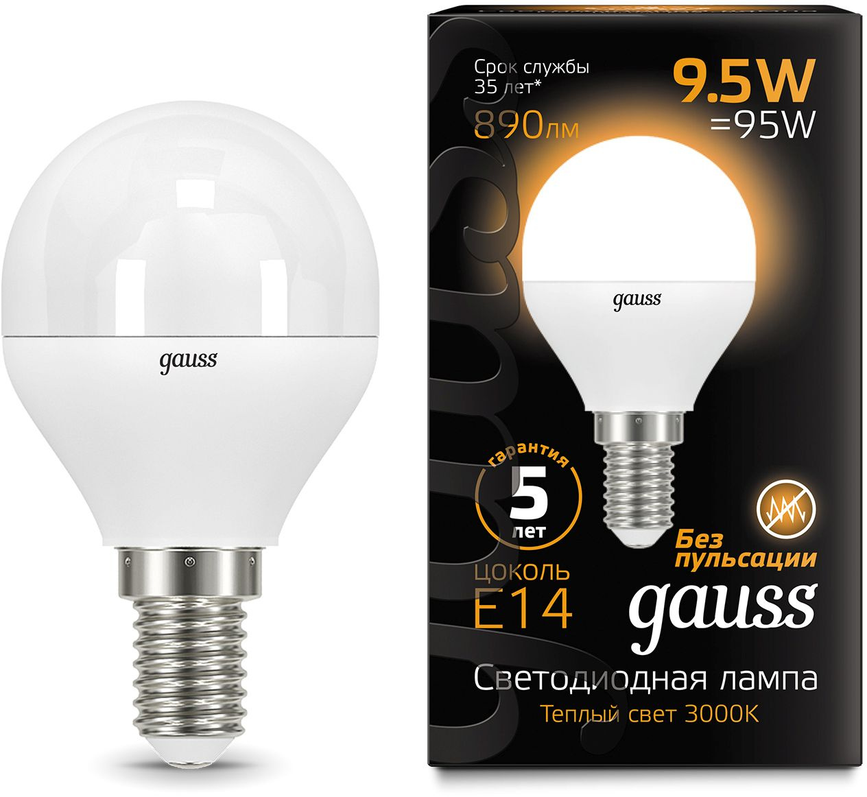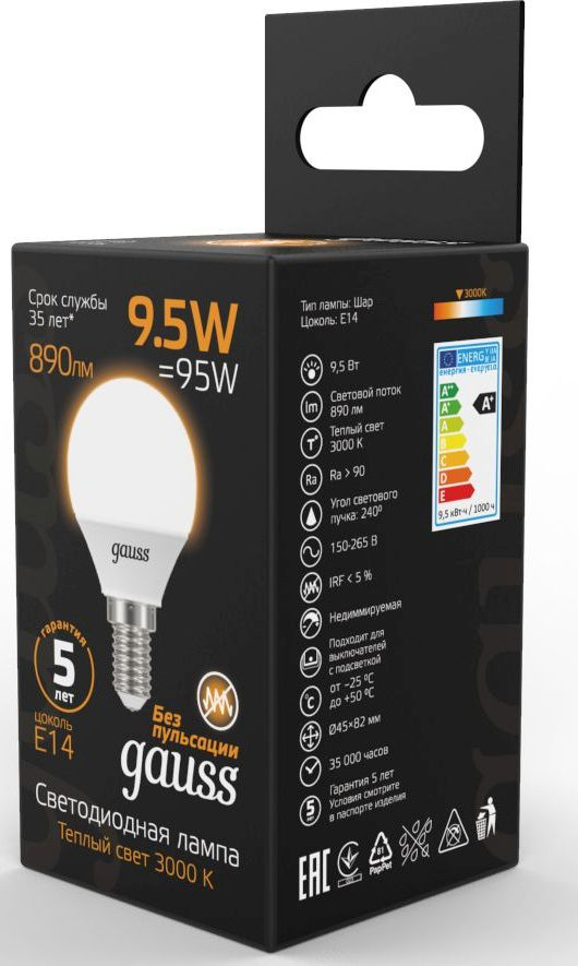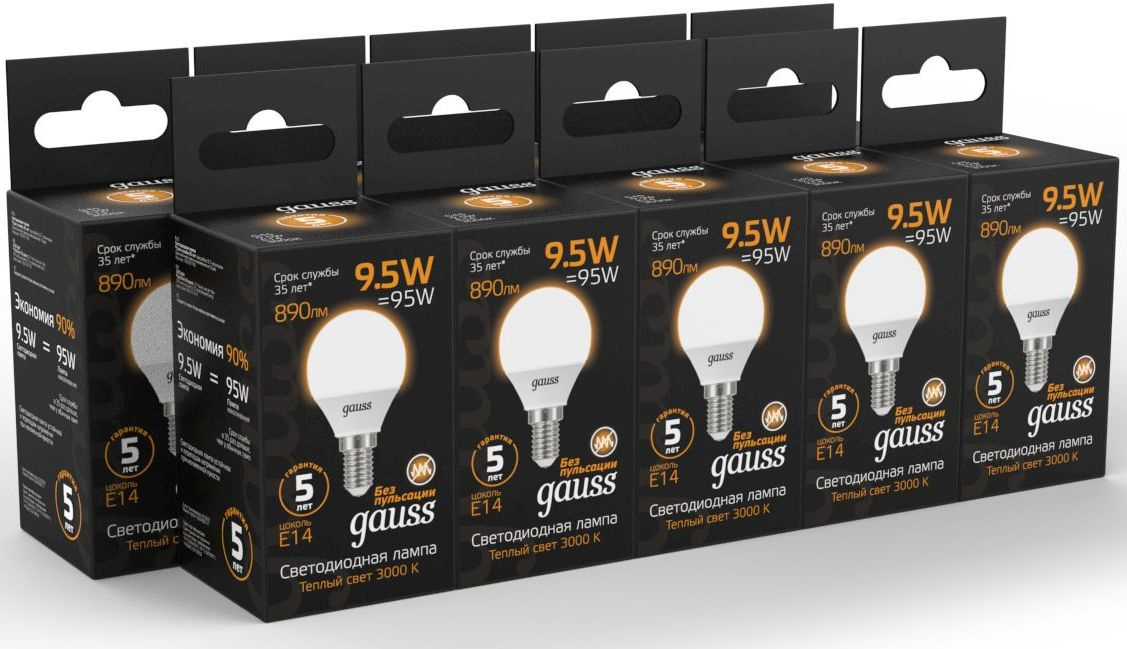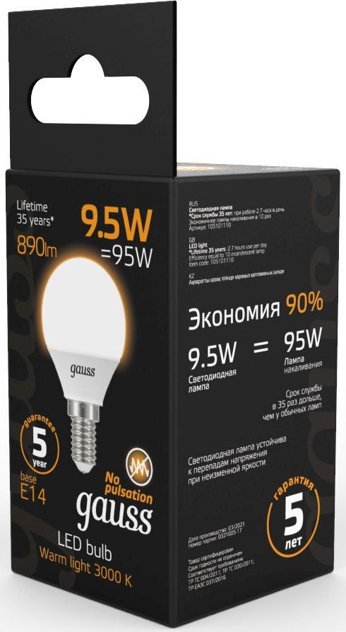 Лампа светодиодная Gauss 9.5Вт цок.:E14 шар 220B св.свеч.бел.теп. (упак.:10шт) (105101110)