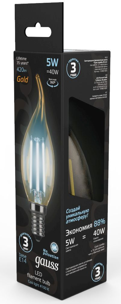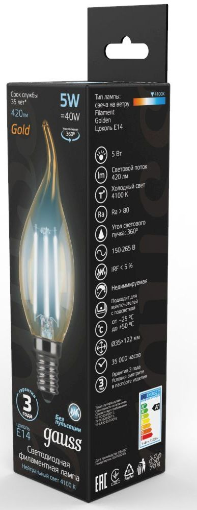 Лампа филам. Gauss Filament 5Вт цок.:E14 свеча 220B св.свеч.бел.нейт. (упак.:1шт) (104801805)