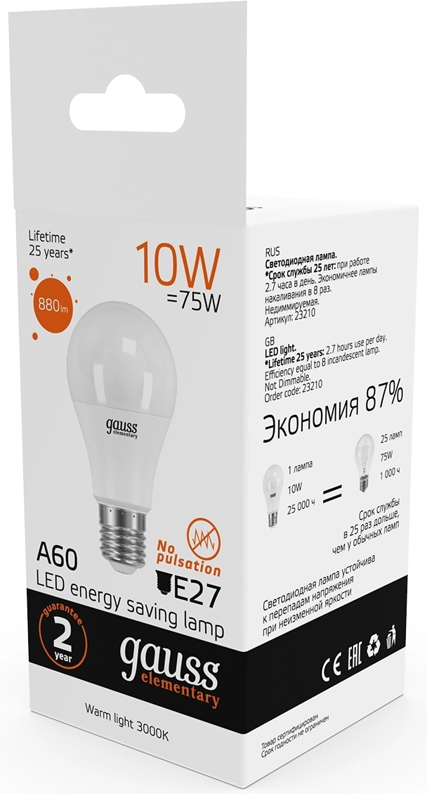 10Вт цок.:E27 груша 220B св.свеч.бел.теп. (упак.:...