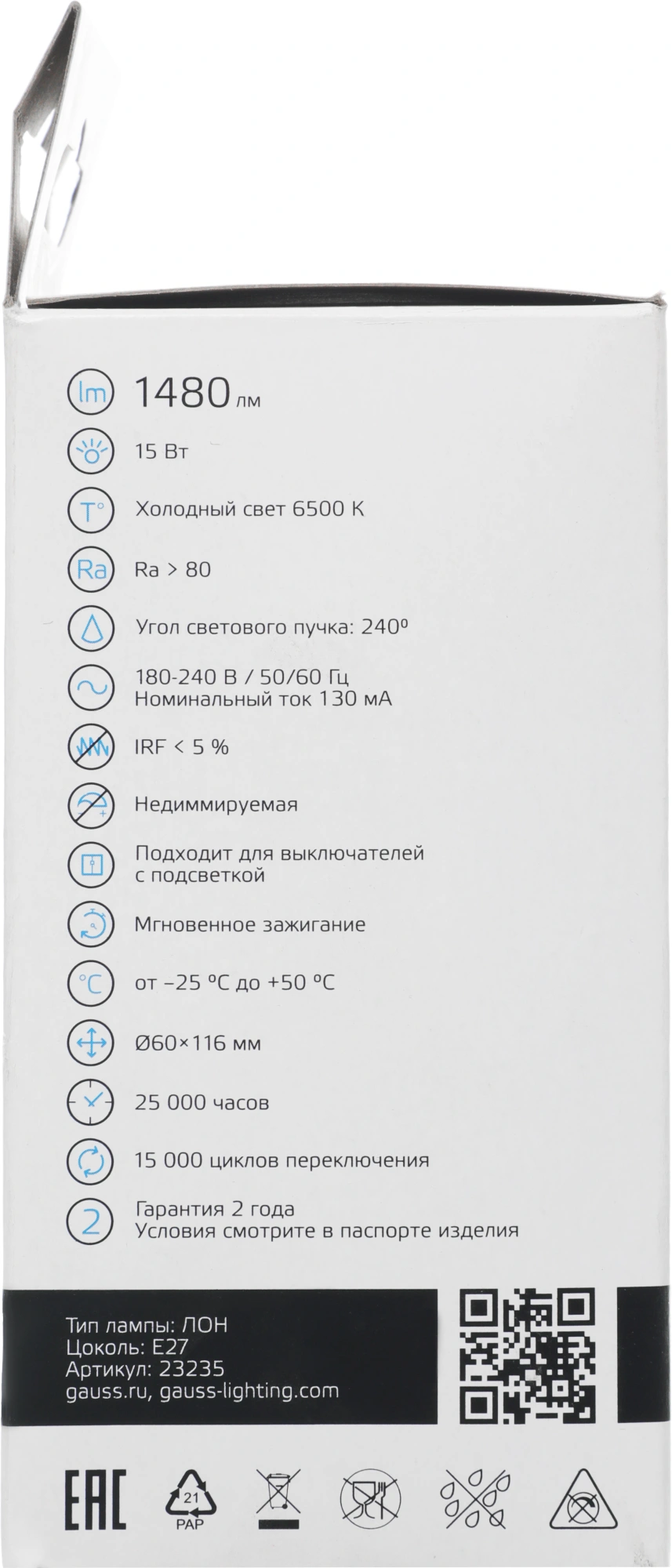 15Вт цок.:E27 груша 220B св.свеч.бел.хол. (упак.:...