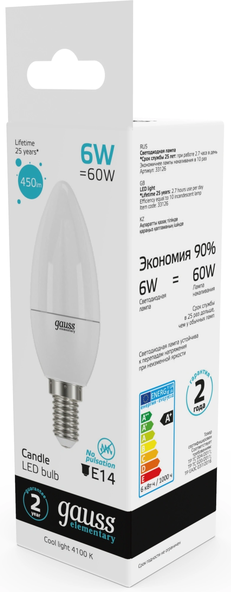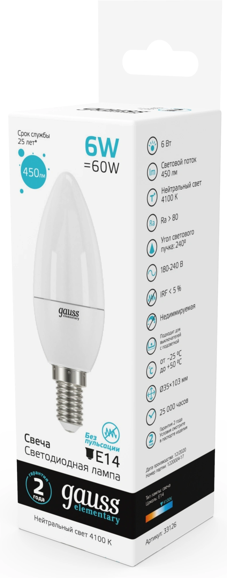 Лампа светодиодная Gauss Elementary 6Вт цок.:E14 свеча 220B св.свеч.бел.нейт. С35 (упак.:1шт) (33126)