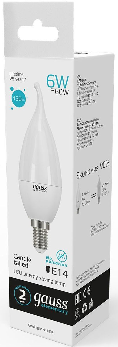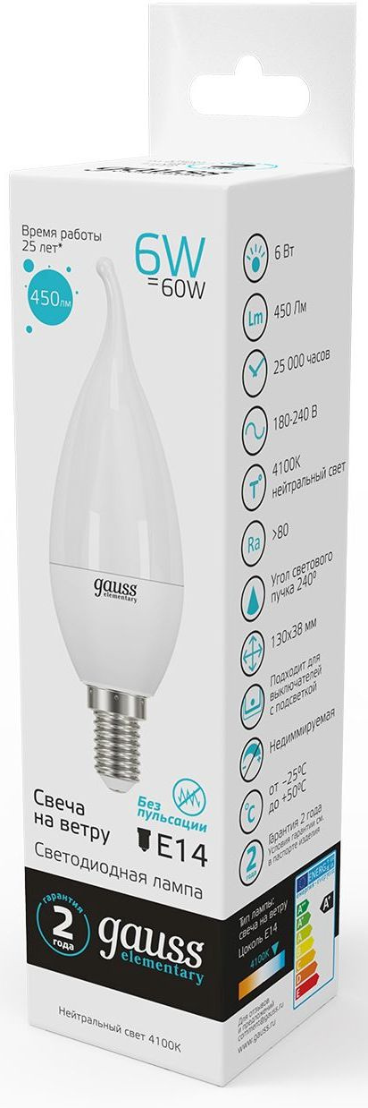 Лампа светодиодная Gauss Elementary 6Вт цок.:E14 свеча 220B св.свеч.бел.нейт. (упак.:10шт) (34126)