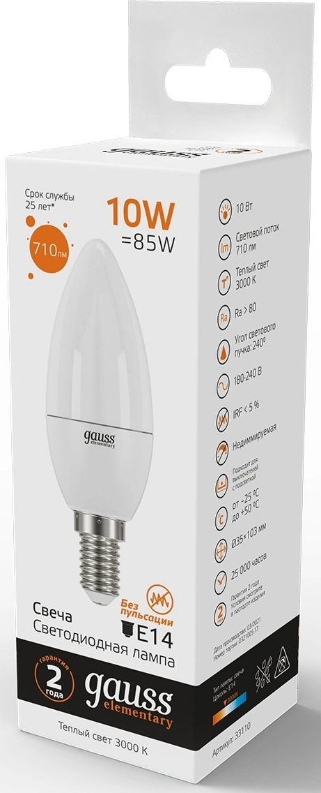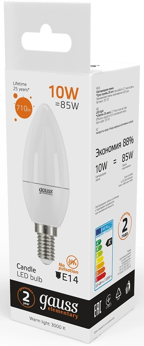 Лампа светодиодная Gauss Elementary 10Вт цок.:E14 свеча 220B св.свеч.бел.теп. (упак.:1шт) (33110)