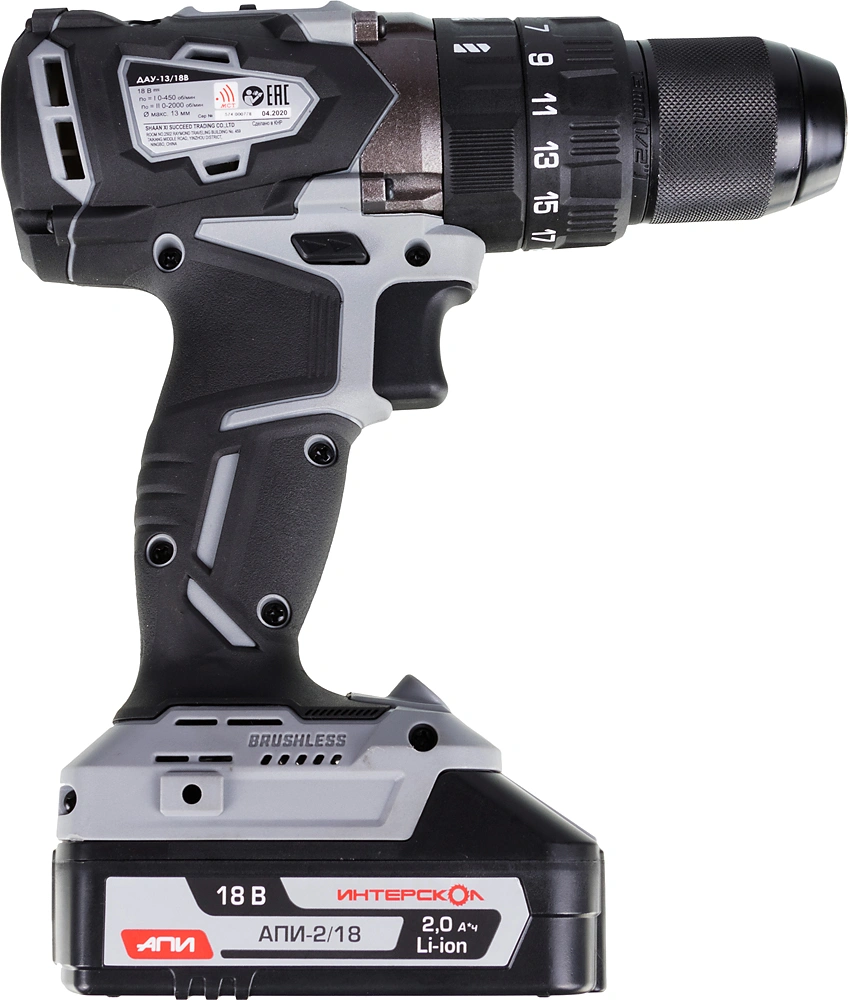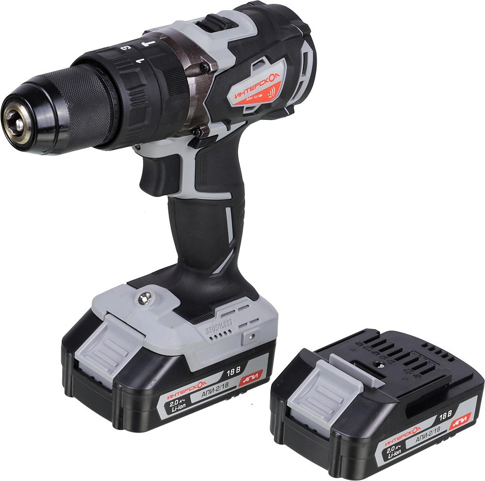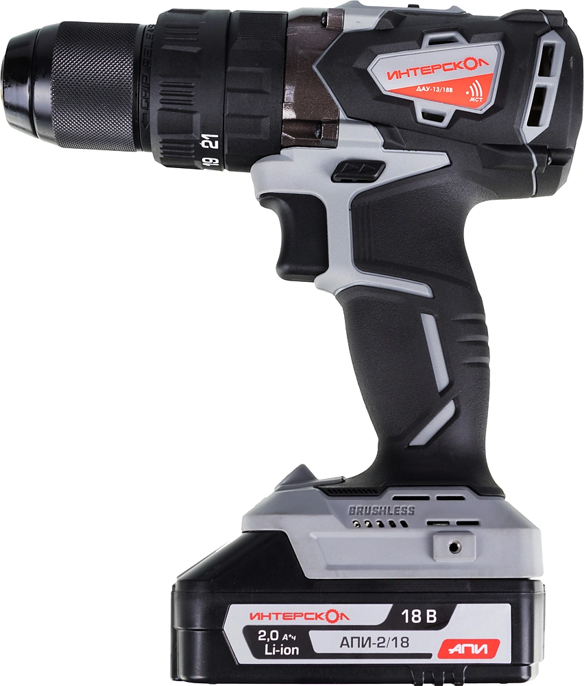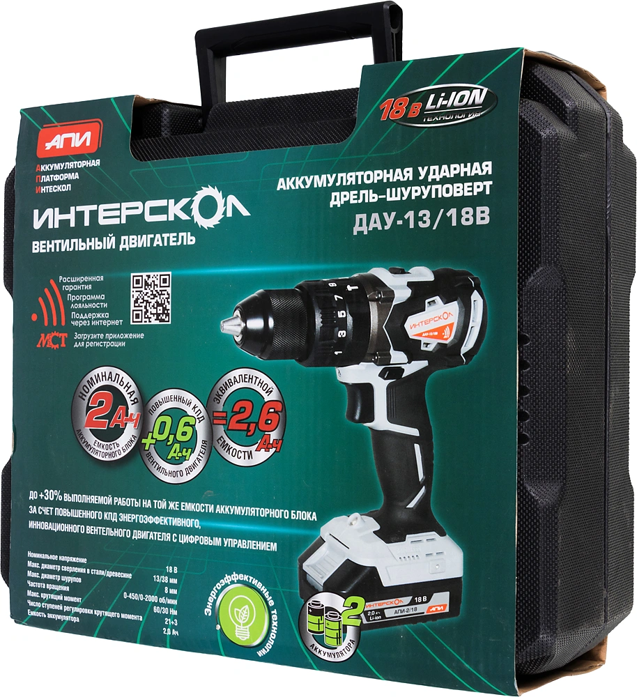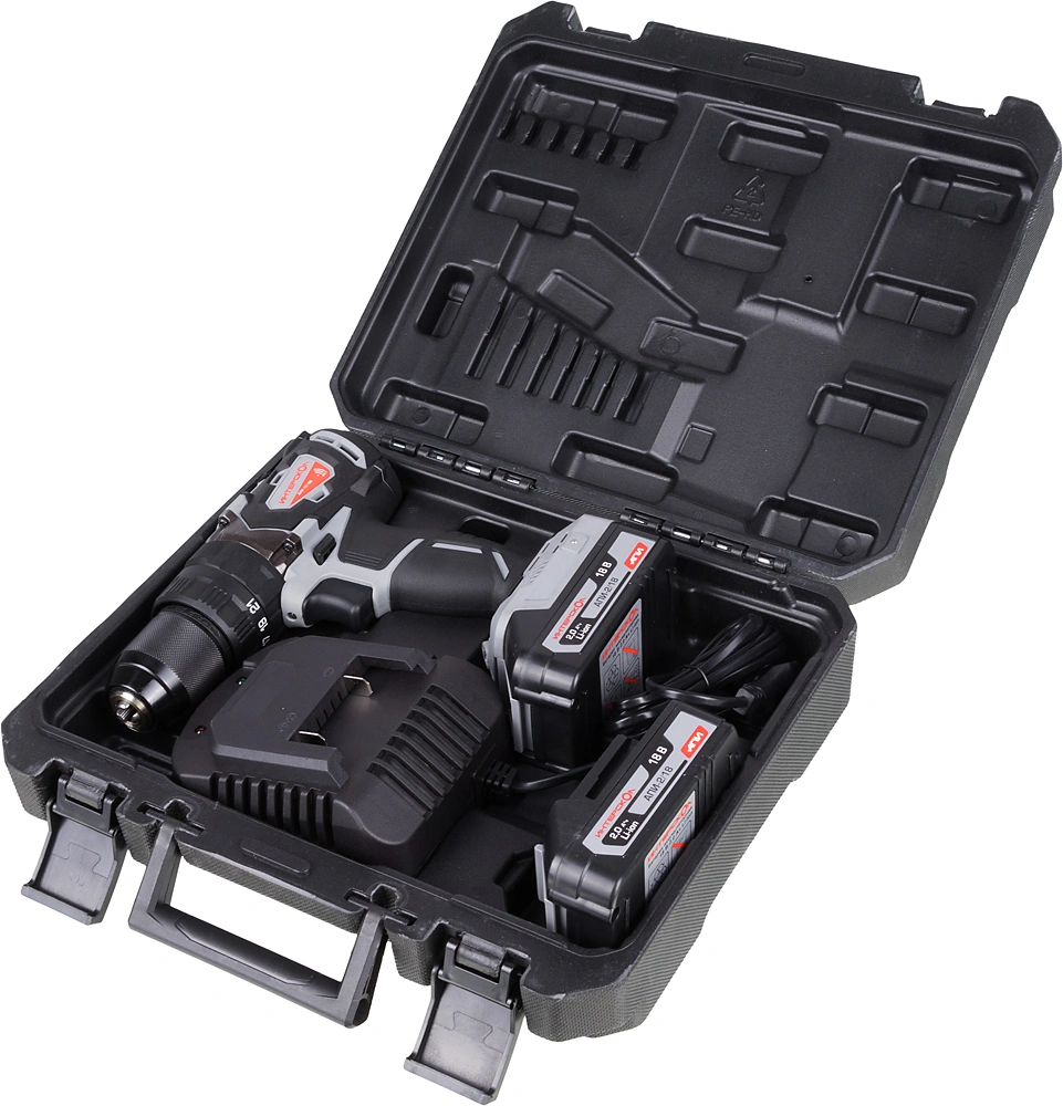 Дрель-шуруповерт, аккумуляторный блок АПИ, 2 шт. 2 Ач., часовое моноблочное зарядное устройство, скоба, кейс пластмассовый, руководство по эксплуатации и инструкция по безопасности, гарантийный талон.