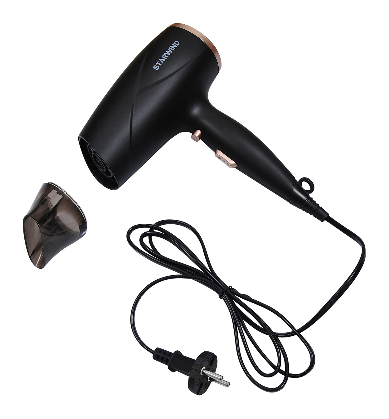Фен STARWIND SHD 6055 – профессиональный прибор для домашнего использования. Вполне классический внешний вид дополнен ярким бархатным черным цветом и минималистичными золотистыми акцентами. Полноразмерный фен является достаточно массивным по весу, но, благодаря удачно продуманной эргономике, комфортно располагается в руке и не вызывает дискомфортных ощущений.
