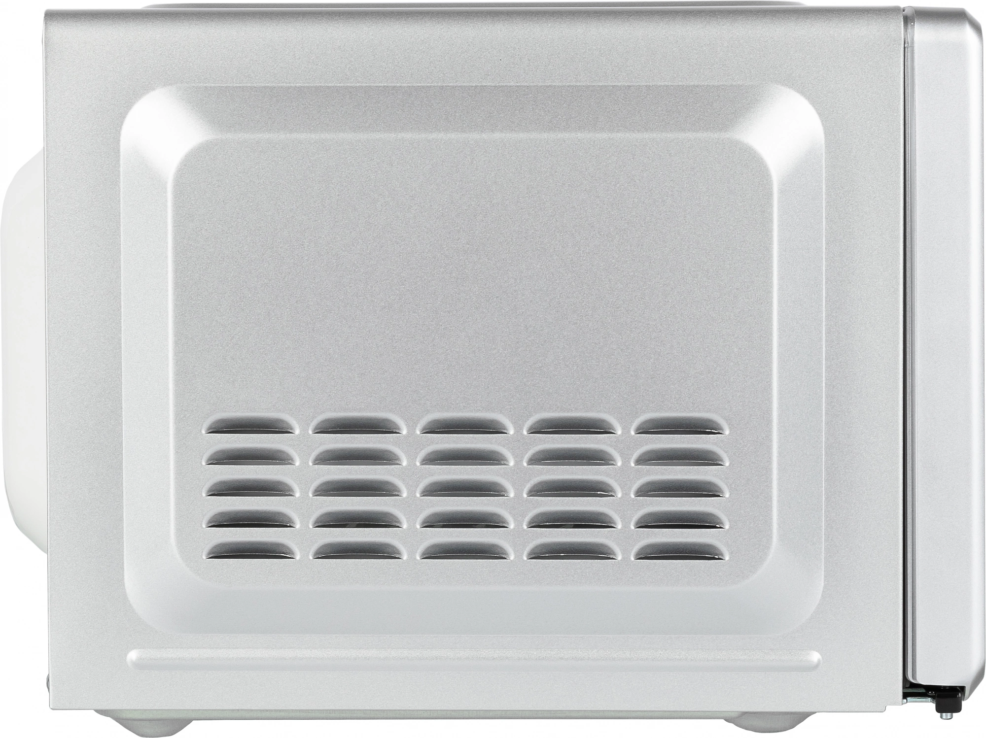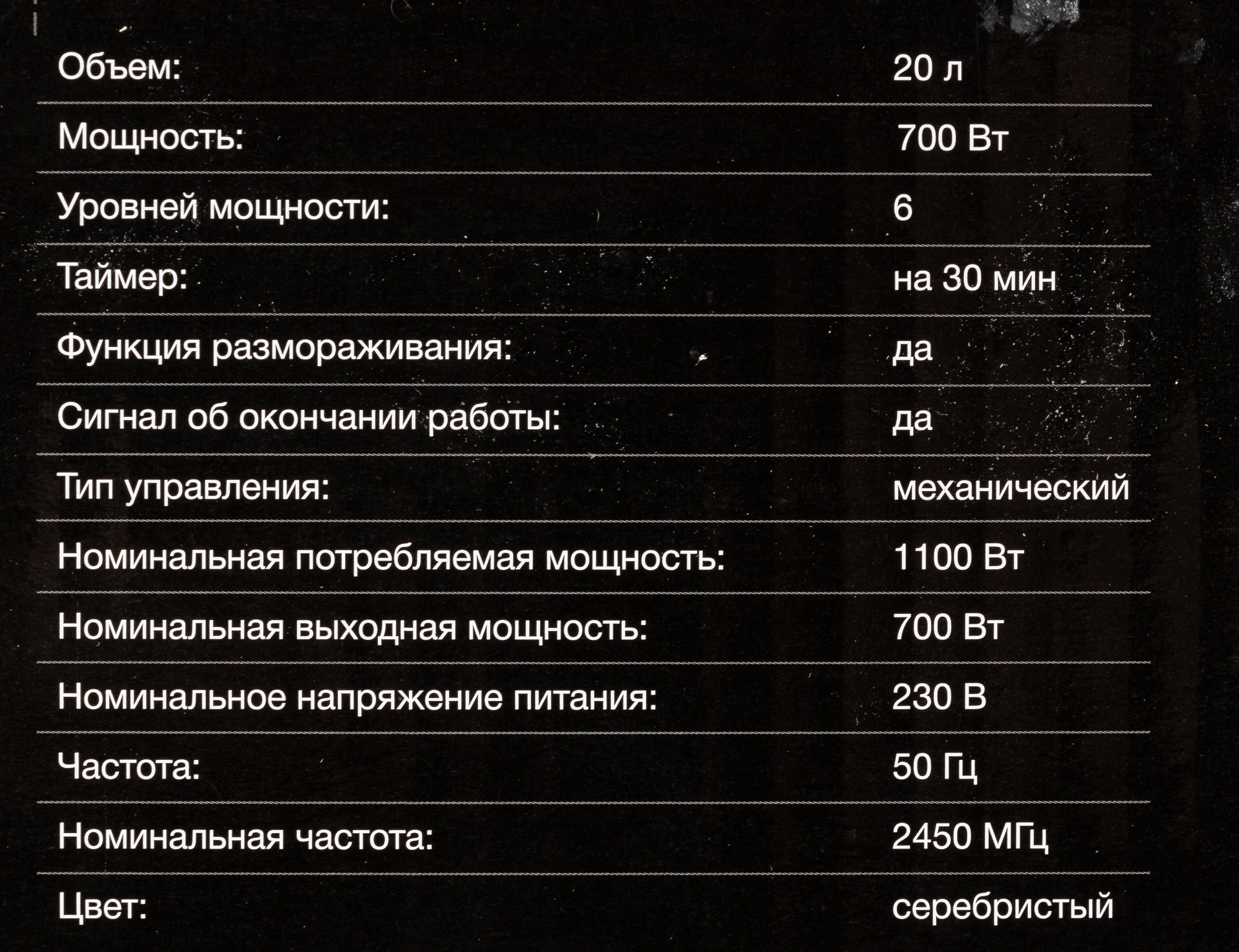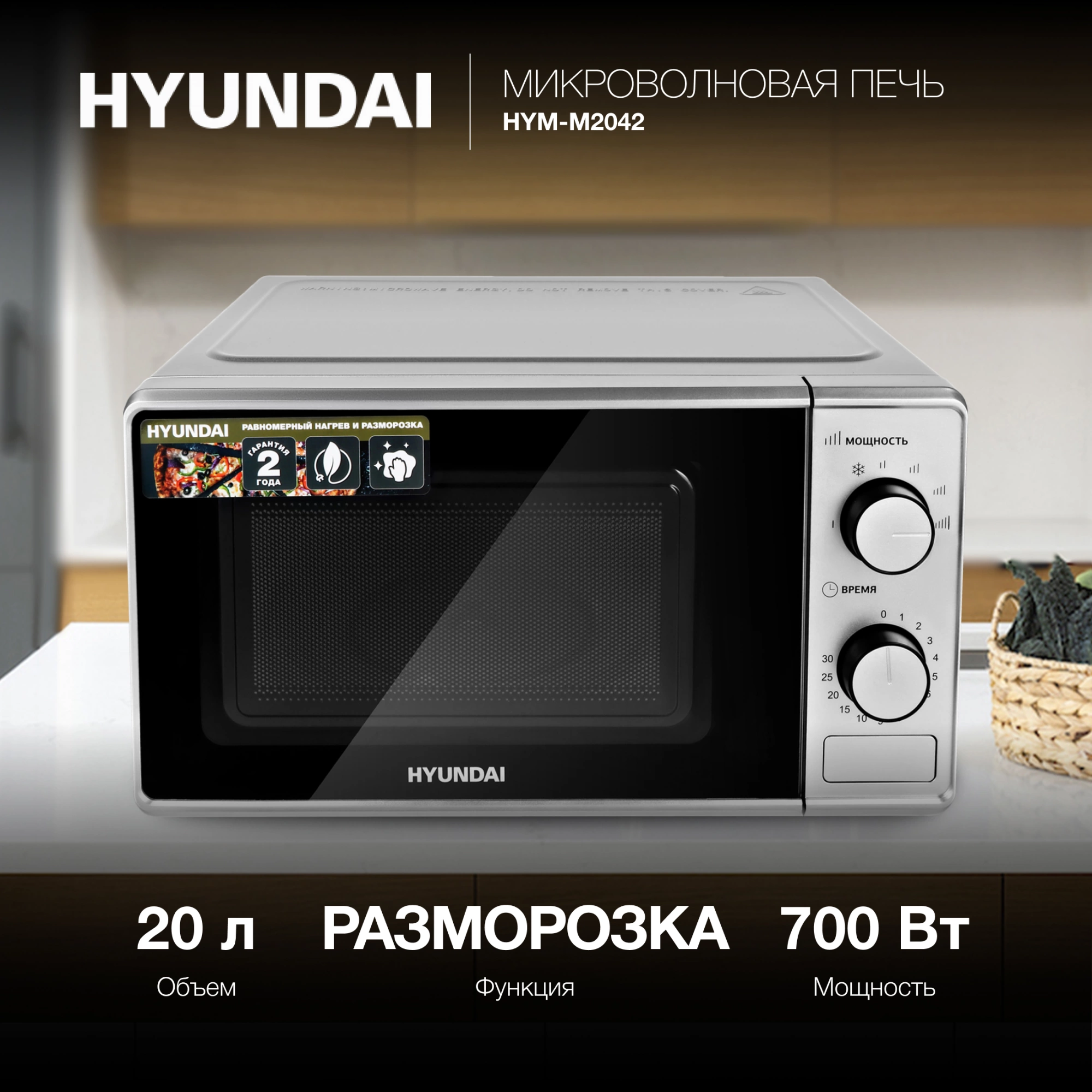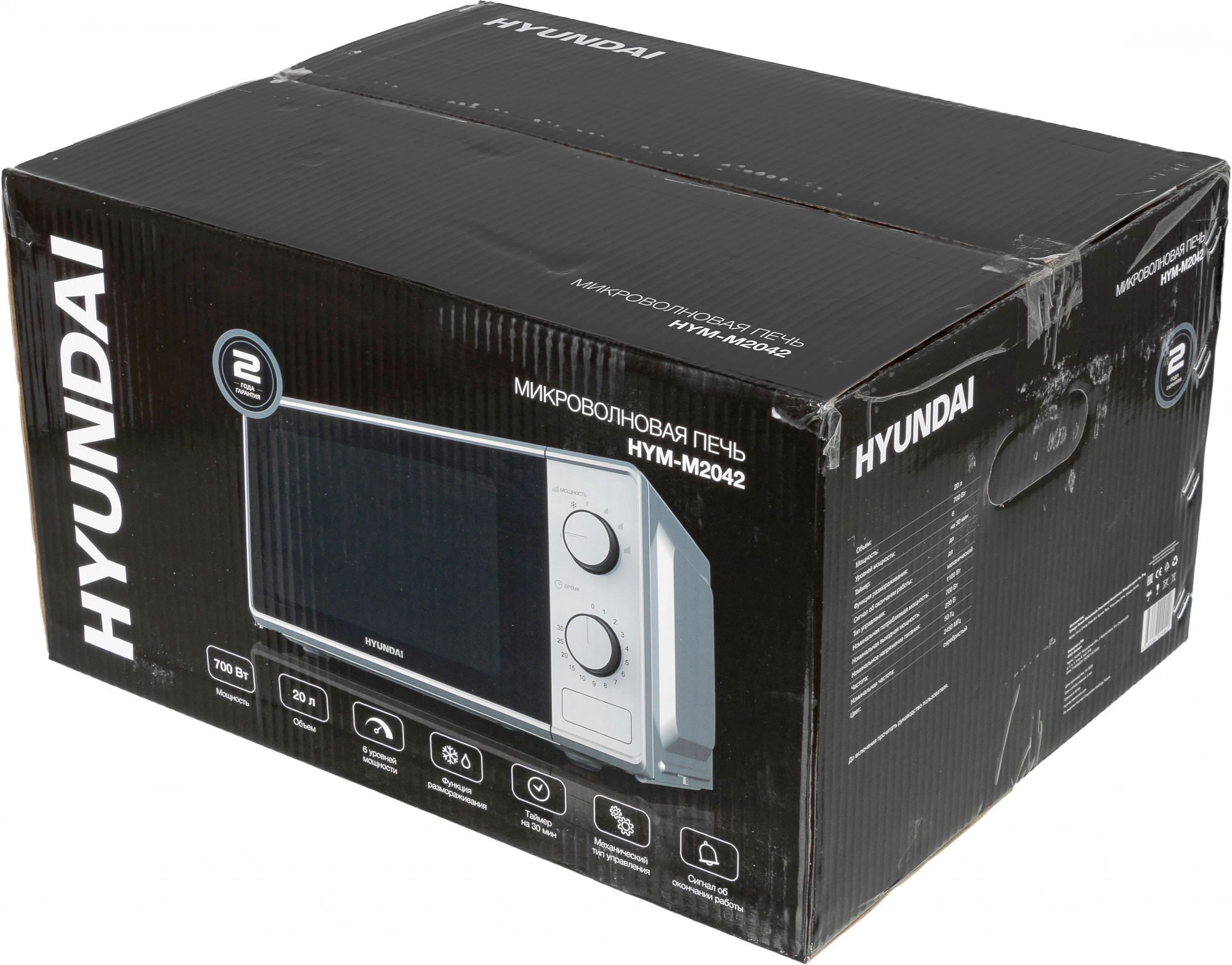 СВЧ Hyundai HYM-M 2042 имеет прочный металлический корпус, окрашенный в приятный серебристый цвет. Акцент составляют окошко темного оттенка и боковые части ручек. Управление осуществляется с помощью поворотных переключателей механического типа. Устанавливаются мощность и время. После окончания работы прозвучит звуковой сигнал и печь отключится. Дверца открывается при помощи специальной кнопки, что обеспечивает герметичность. Внутренняя поверхность выполнена из эмали с гладкой фактурой, с которой легко убираются все виды загрязнений. Устанавливается устройство на столешницу, прорезиненные ножки исключают скольжение по любым видам поверхностей. Печь станет удачным дополнением интерьера кухни, лаконично впишется в любое цветовое решение. Кабель питания крепится сзади и имеет достаточную длину для комфортного подключения.