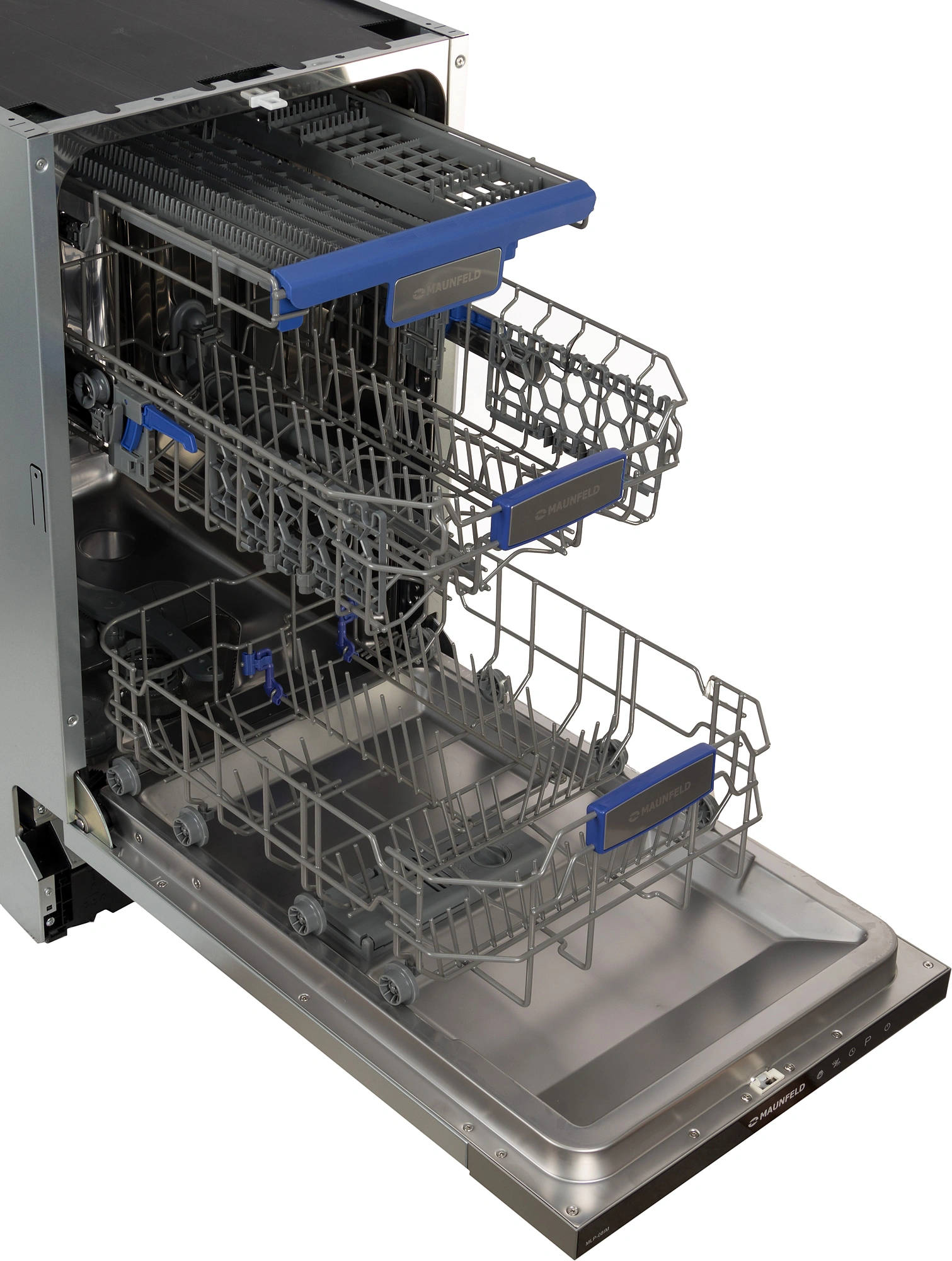 корзина для столовых приборов, освещение, полки для кружек, разбрызгиватель над верхней корзиной, регулируемая по высоте корзина для посуды, складные держатели тарелок