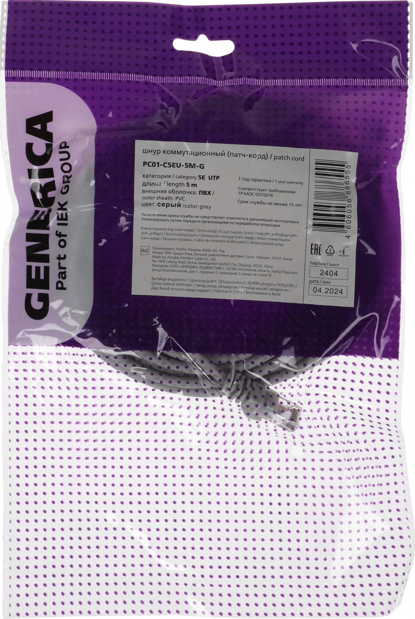 Патч-корд ITK PC01-C5EU-5M-G UTP RJ-45 вил.-вилка RJ-45 кат.5E 5м серый ПВХ (уп.:1шт)