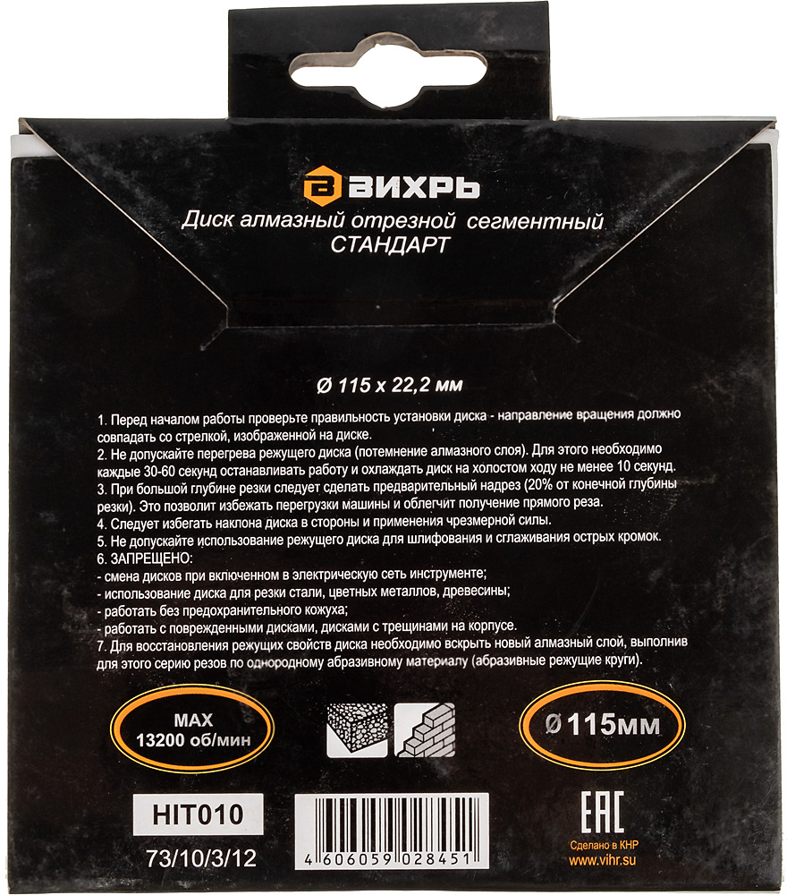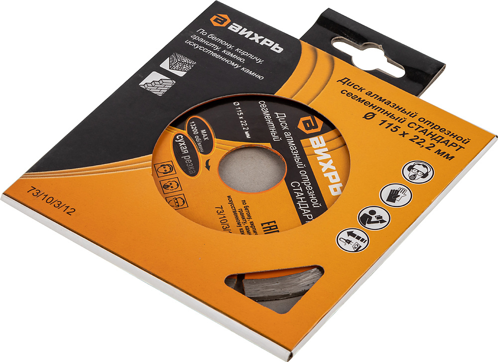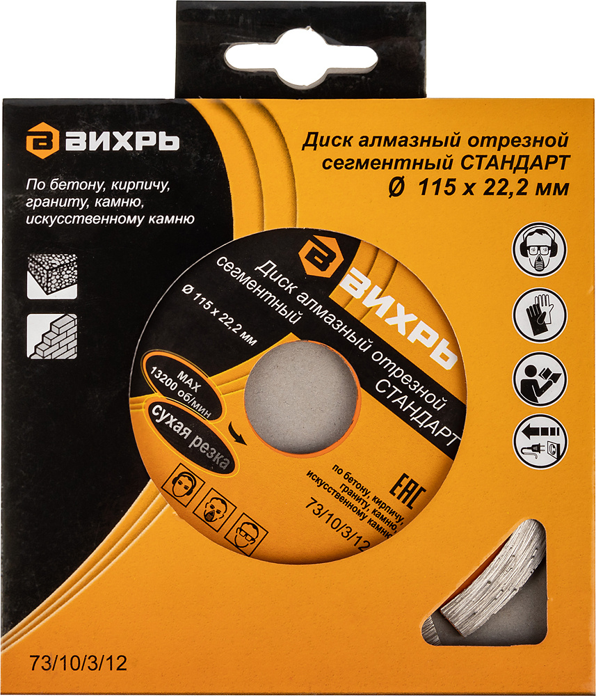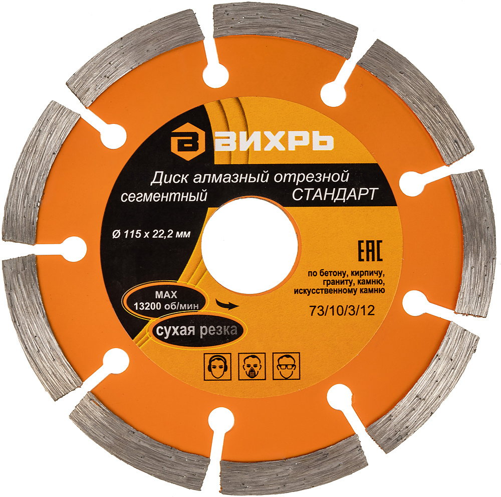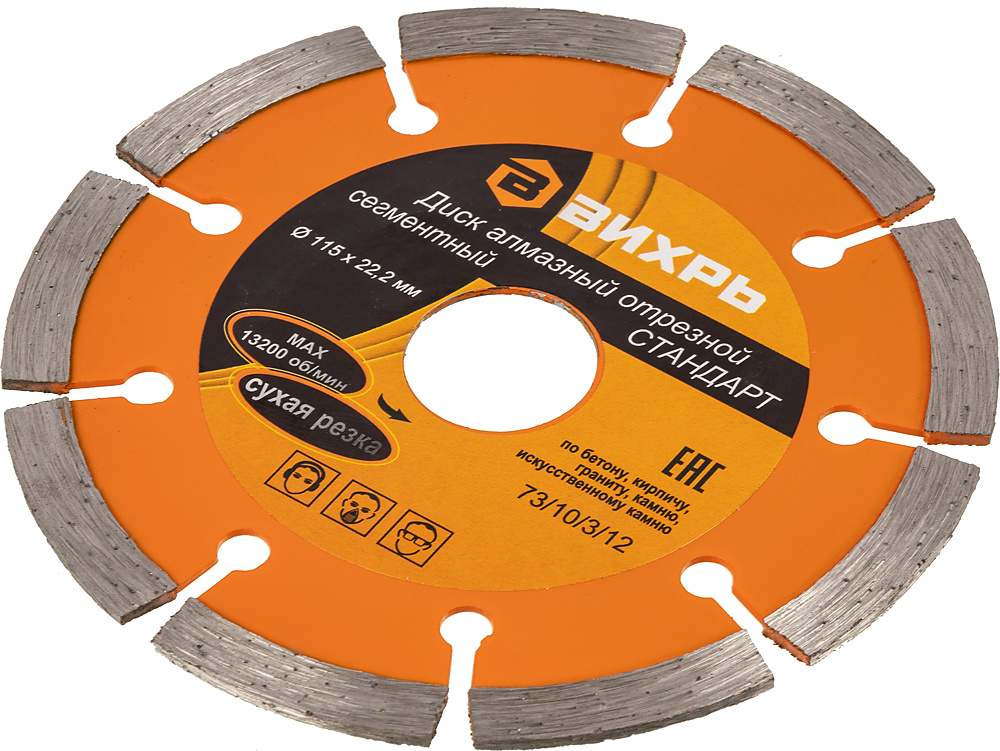 Диск алмазный отрезной сегментный СТАНДАРТ, 115х22,2 мм, сухая резка Вихрь - это алмазный отрезной диск, который используется совместно с угловыми шлифмашинами (болгарками) для сухой резки гранитных, бетонных, кирпичных и каменных изделий.