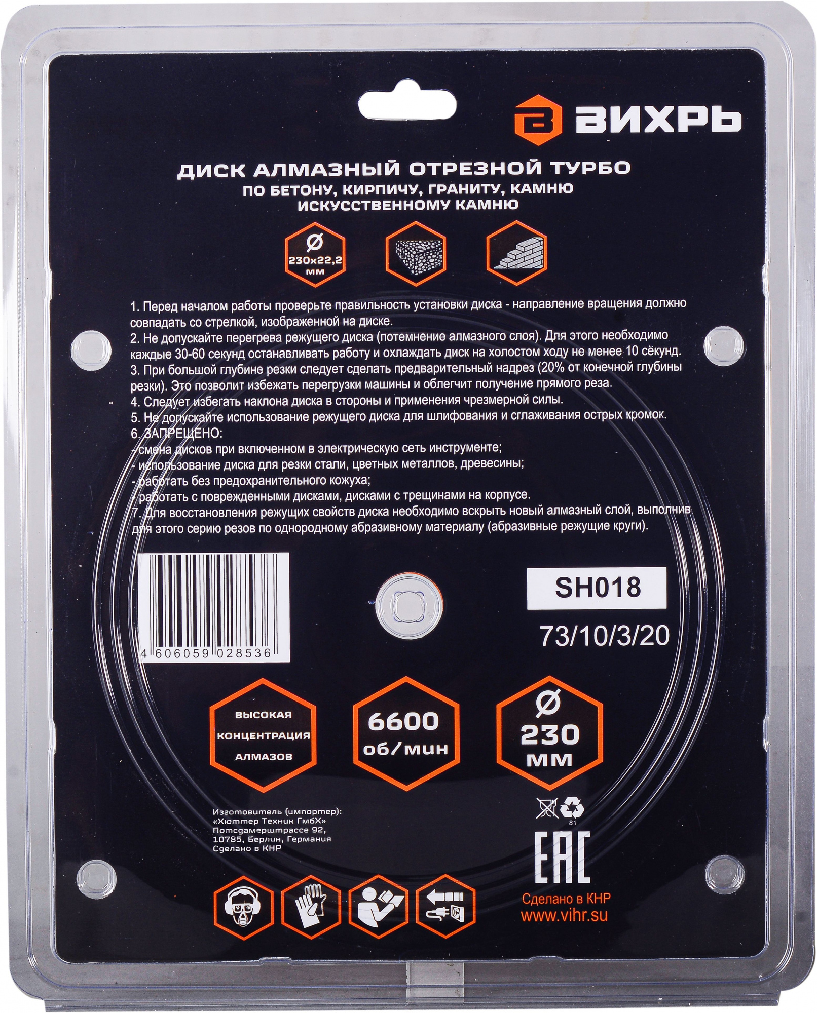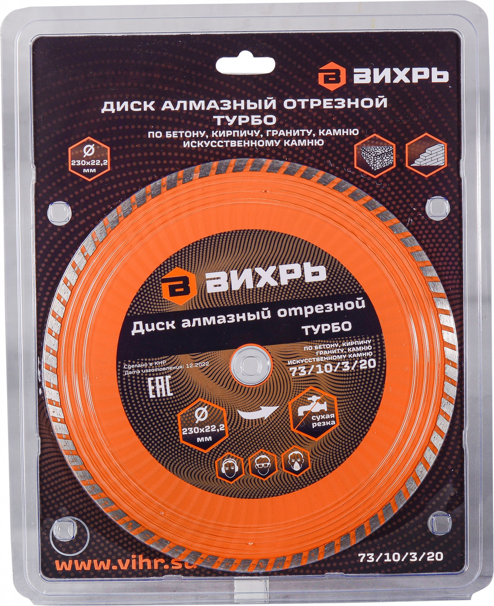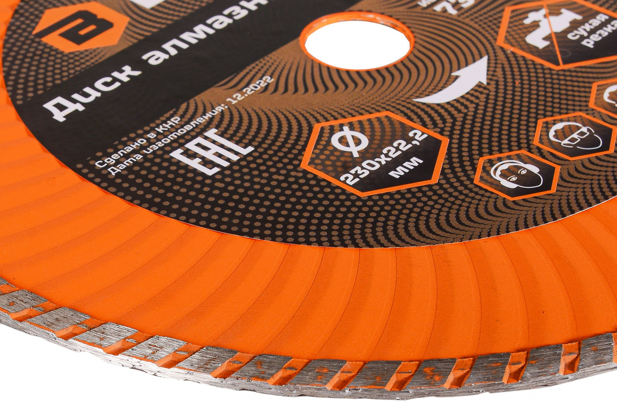 Диск алмазный отрезной Турбо 230 х 22,2 мм, сухая резка Вихрь - это алмазный отрезной диск, который используется совместно с угловыми шлифмашинами (болгарками) для сухой резки гранитных, бетонных, кирпичных и каменных изделий.