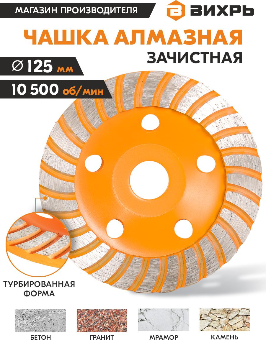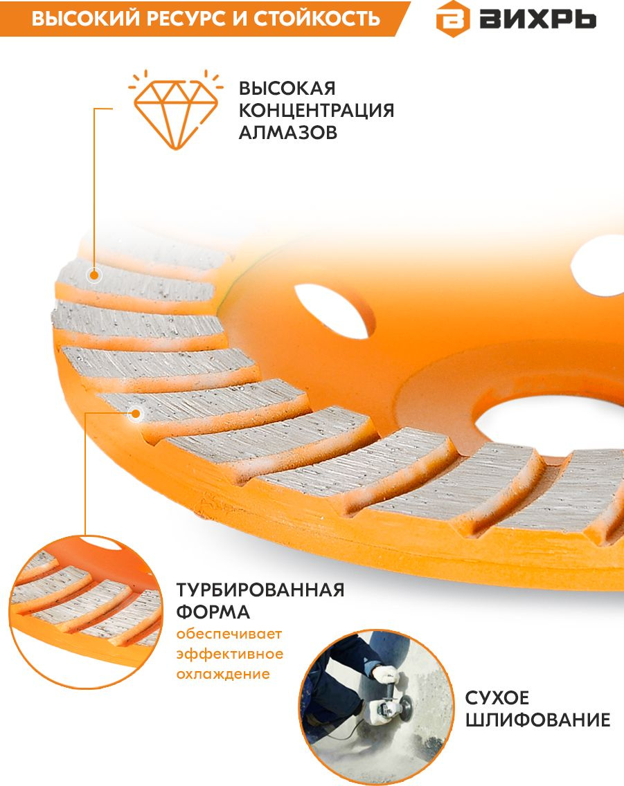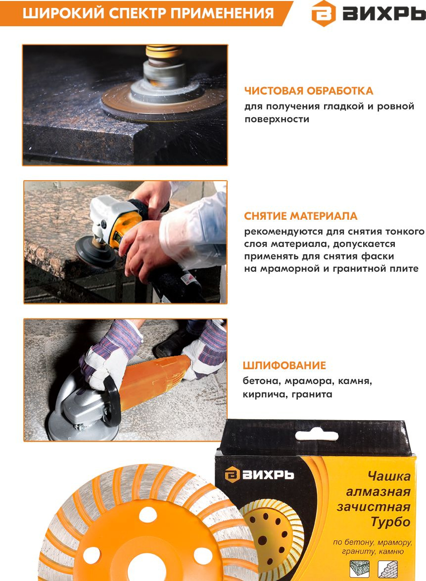 Предназначены для шлифования бетона, мрамора, камня, кирпича, гранита. Рекомендуются для снятия тонкого слоя материала. Допускается применять для снятие фаски на мраморной и гранитной плите. Турбированная форма, обеспечивает эффективное охлаждение.