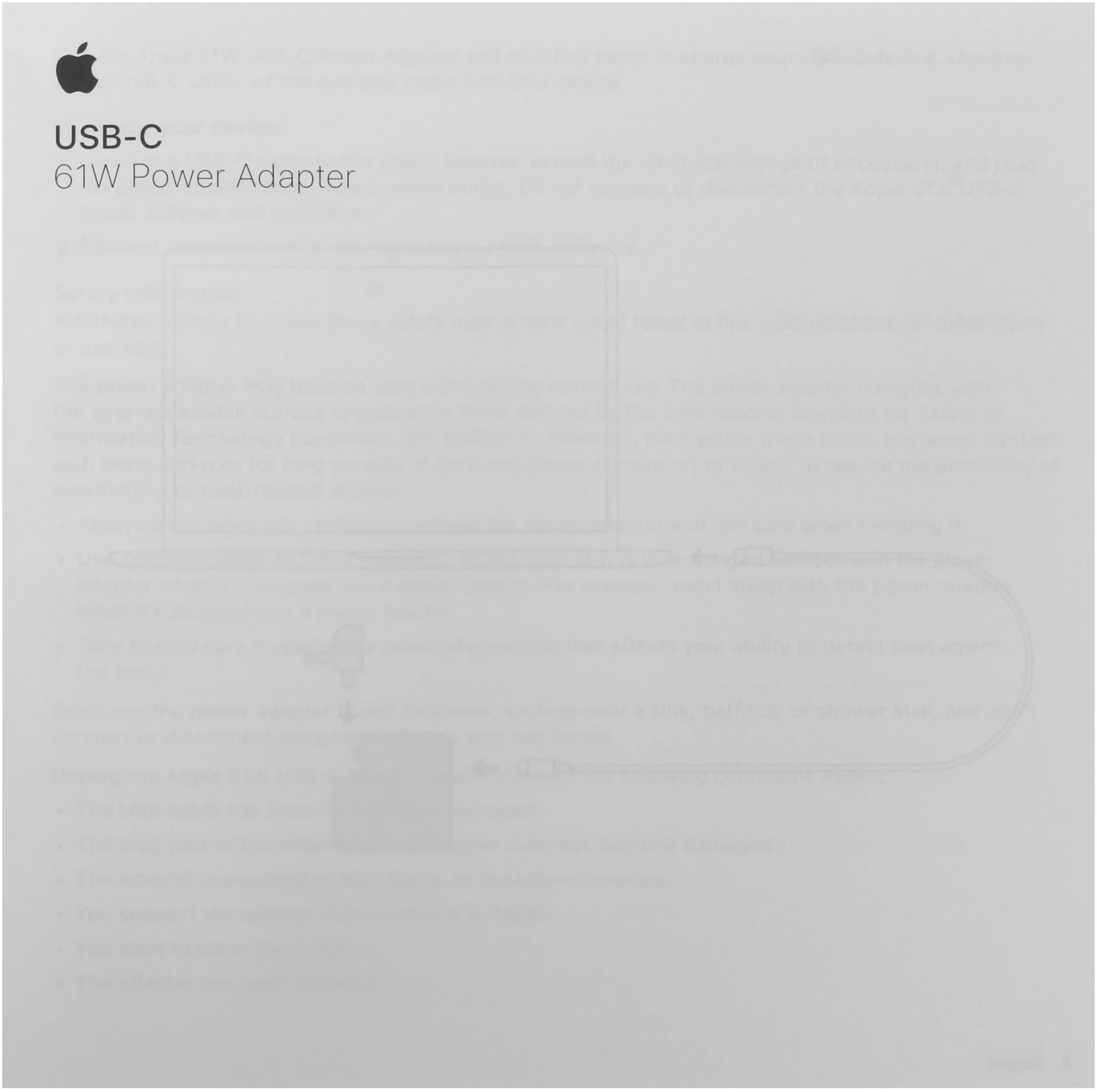 Адаптер питания USB-C мощностью 61 Вт позволяет быстро и эффективно заряжать устройство дома, в офисе или в пути.