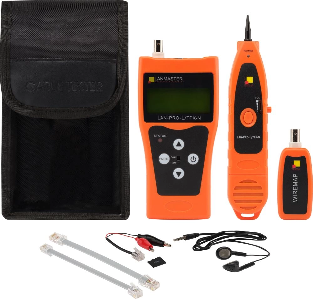 Главный блок, индуктивный щуп, ответная часть, батарея 6F22 9V — 2 шт., кабель RJ45, кабель RJ11, Кабель RJ11 - крокодилы, наушники, сумка-чехол на ремне, инструкция по эксплуатации.