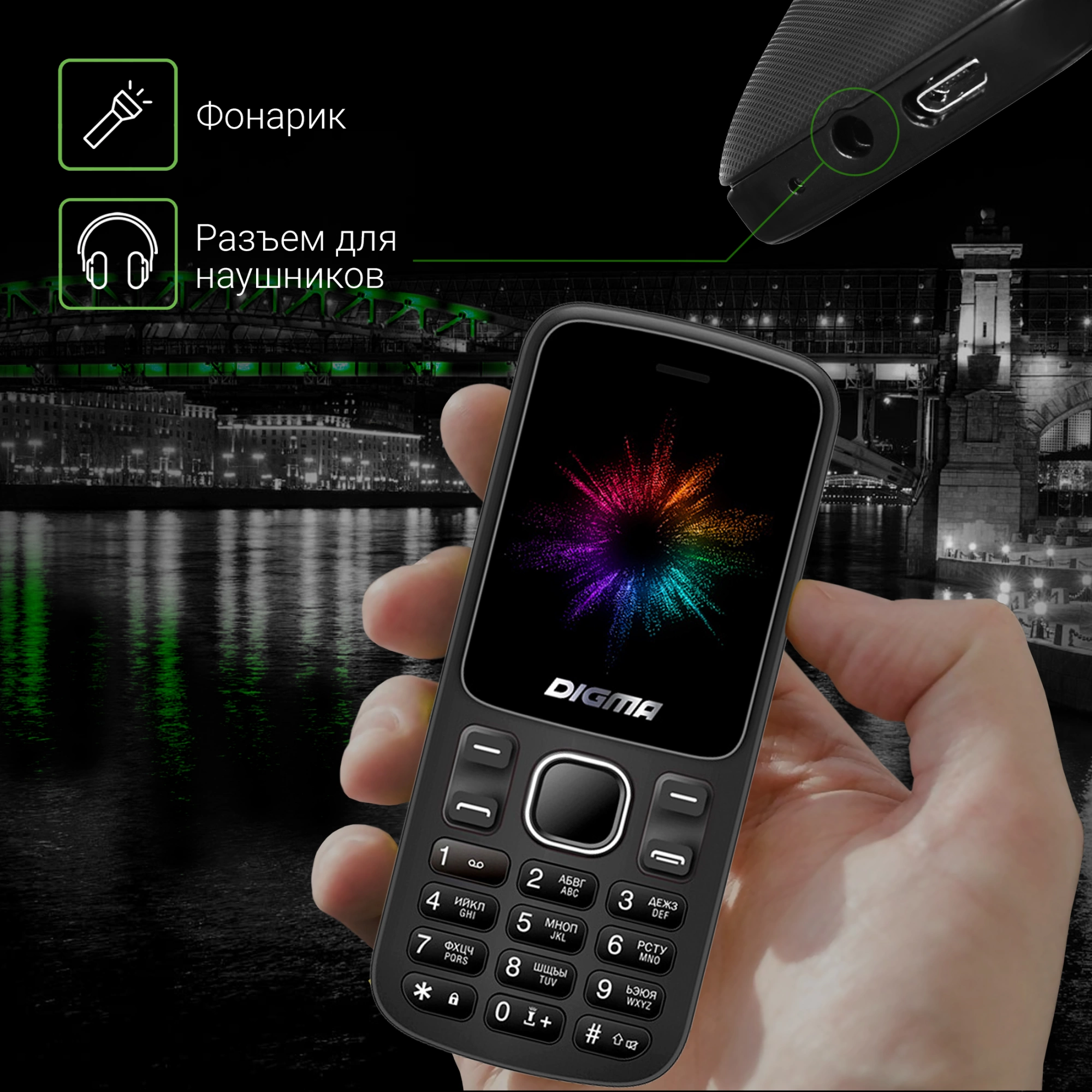 Встроенный фонарик расширяет функциональные возможности кнопочного телефона: удобно при недостаточном освещении. Слот для карты памяти формата microSD объемом 32 ГБ позволит хранить на телефоне больше файлов. А разъем 3,5 мм дает возможность подключить к телефону наушники: слушайте песни, не отвлекая окружающих.