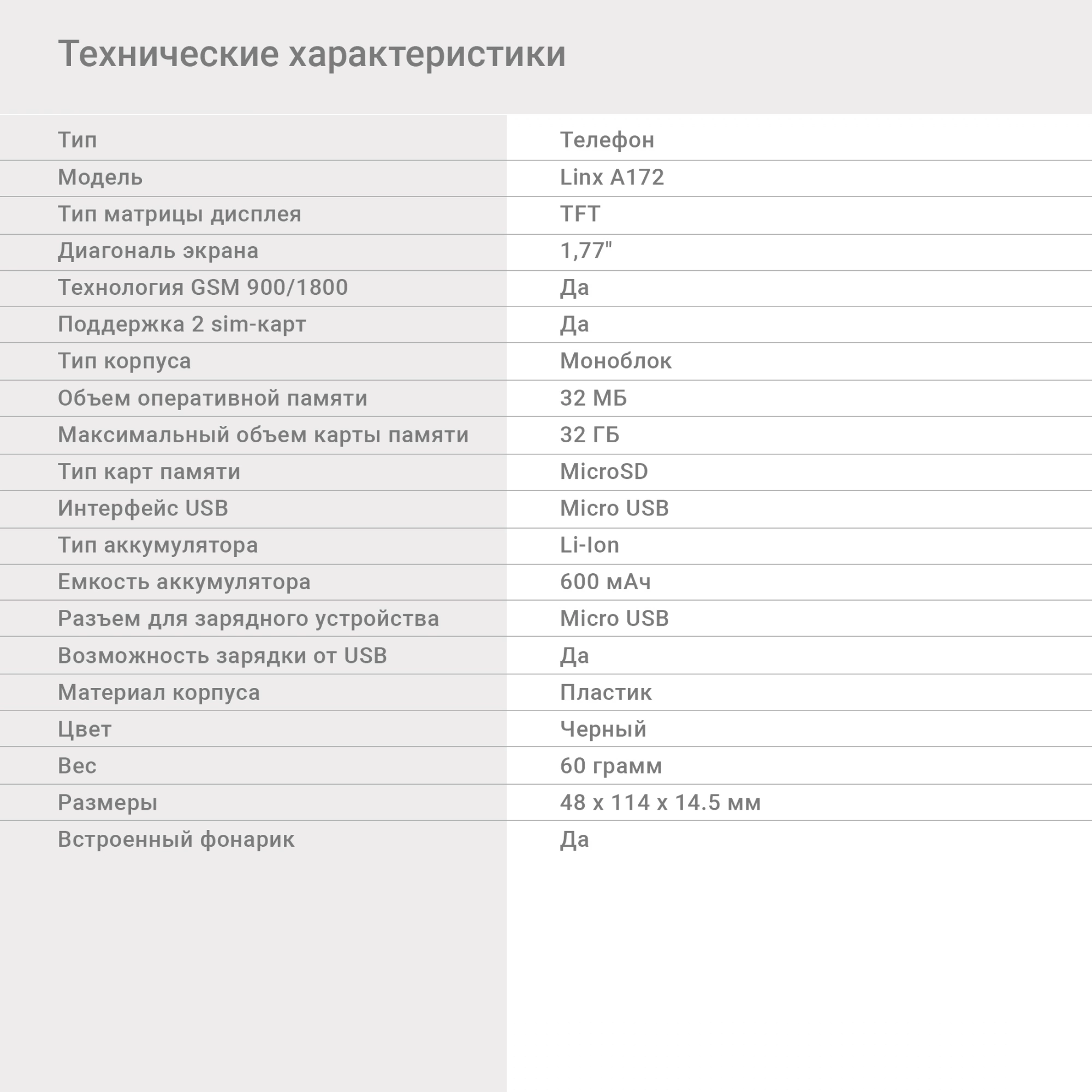 Благодаря весу 60 г и компактным размерам 48 х 114 х 14,5 мм кнопочный телефон не займет много места в сумке. Минималистичный дизайн и классический черный цвет превращают устройство в настоящий аксессуар.