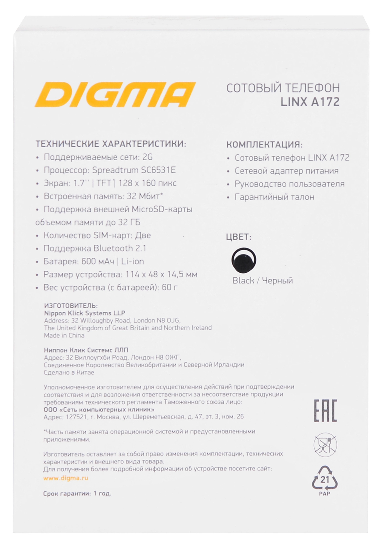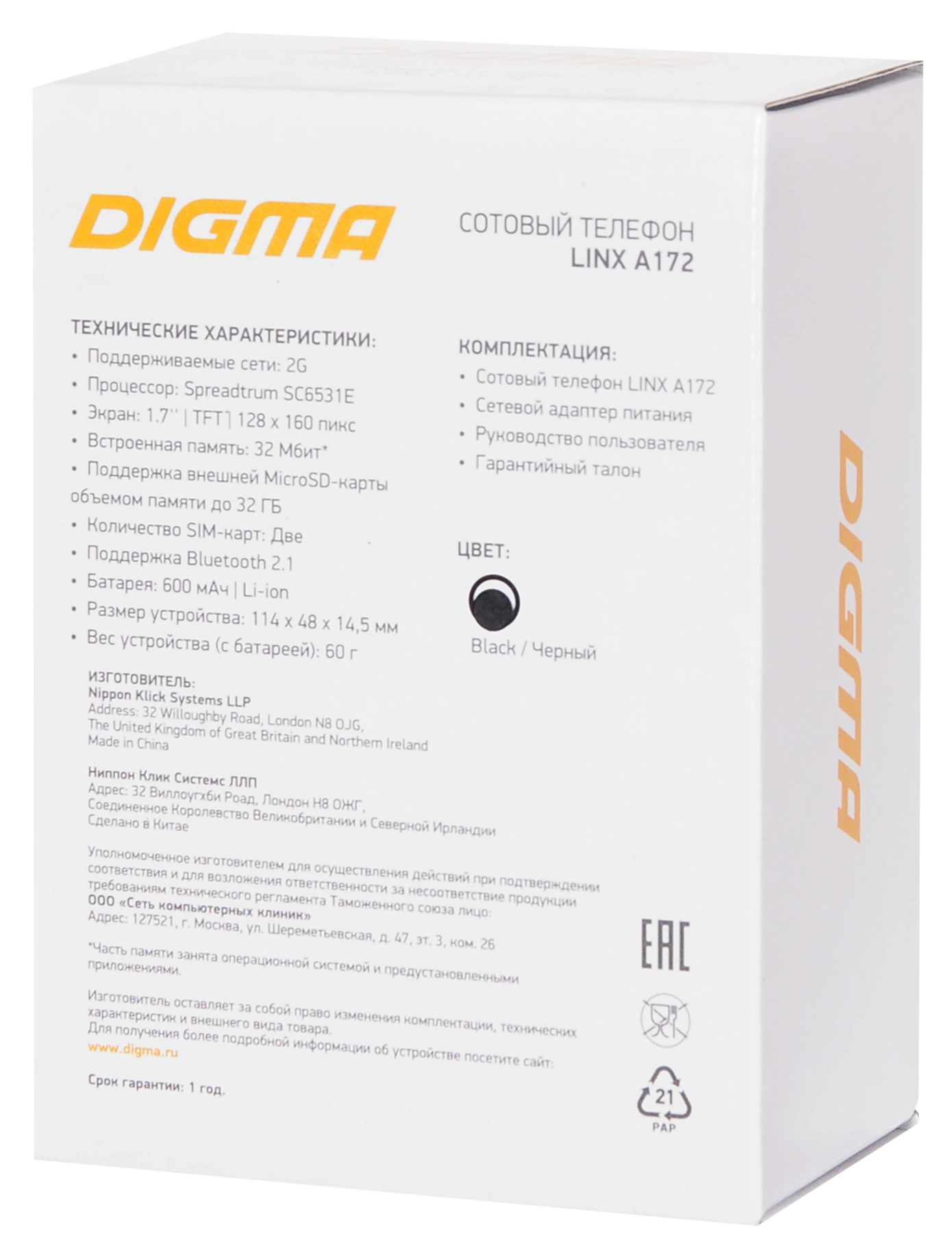 Мобильный телефон Digma Linx A172 поможет вам всегда оставаться на связи с близкими людьми.