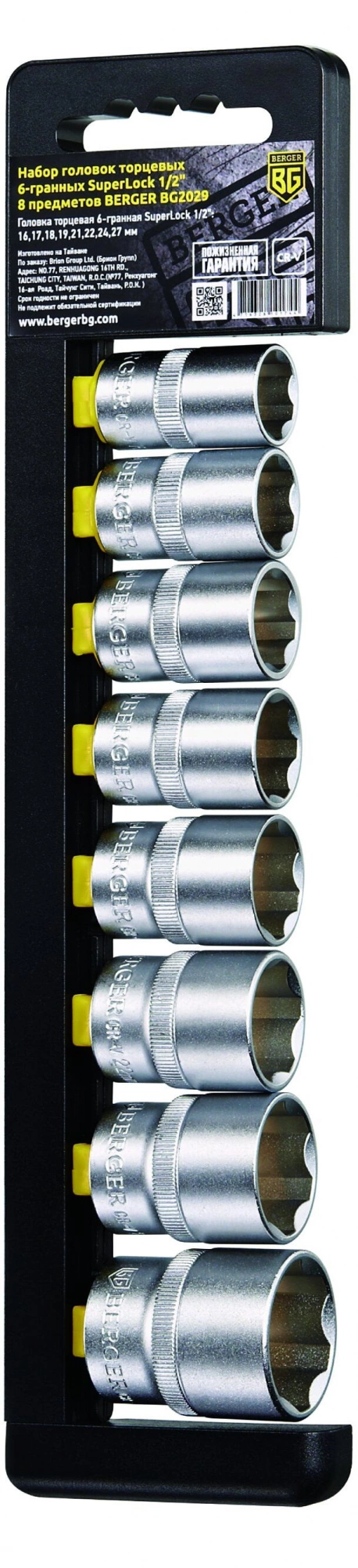 Набор головок торцевых 6-гранных SuperLock 1/2" 8 предметов BERGER. 8шт.- головка торцевая 6-гранная Super lock 1/2": 16, 17, 18, 19, 21, 22, 24, 27 мм.