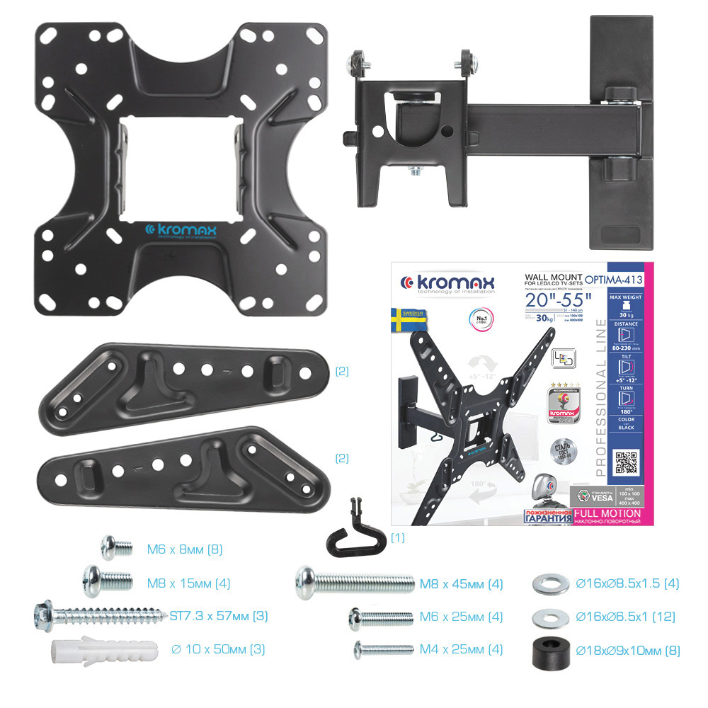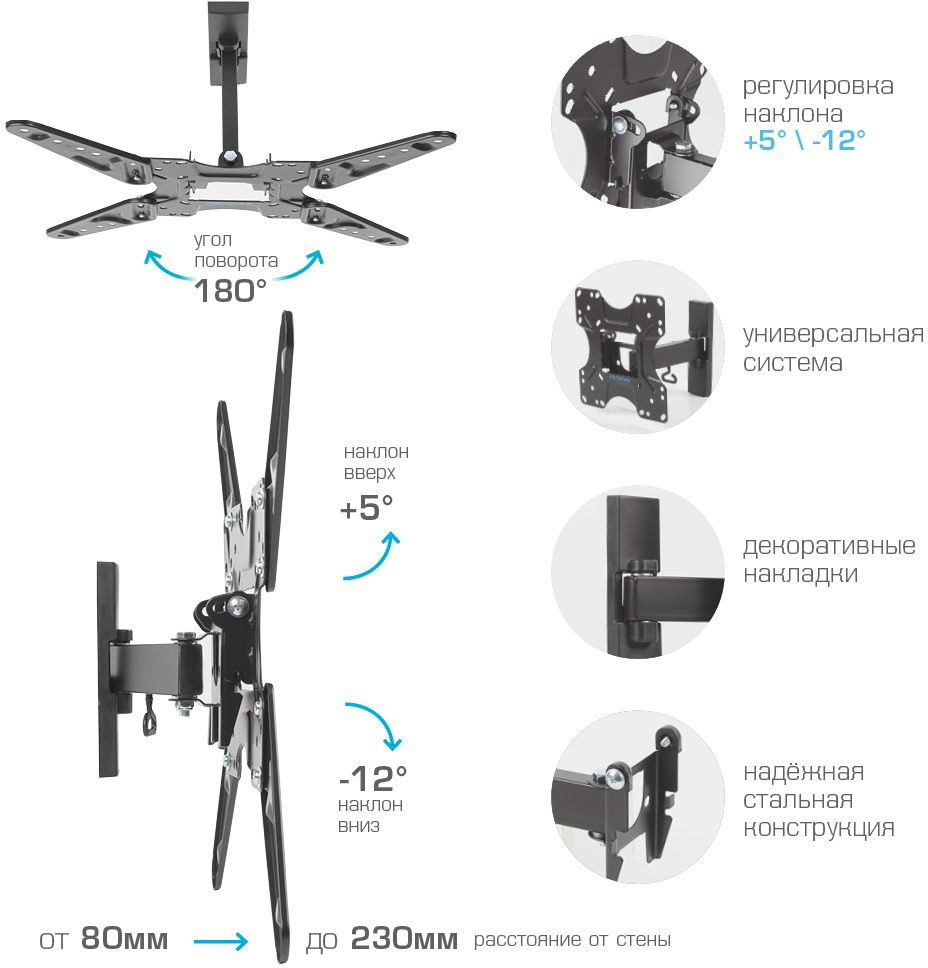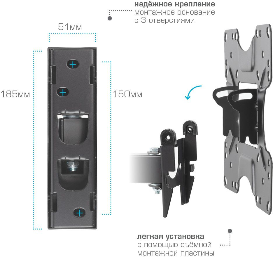 Легкий монтаж при помощи съемной монтажной пластины. Надежная стальная конструкция. Универсальный телевизор на кронштейне можно наклонить, повернуть и сдвинуть к стене.