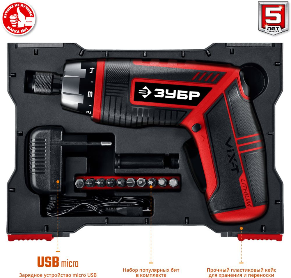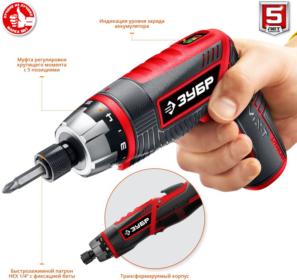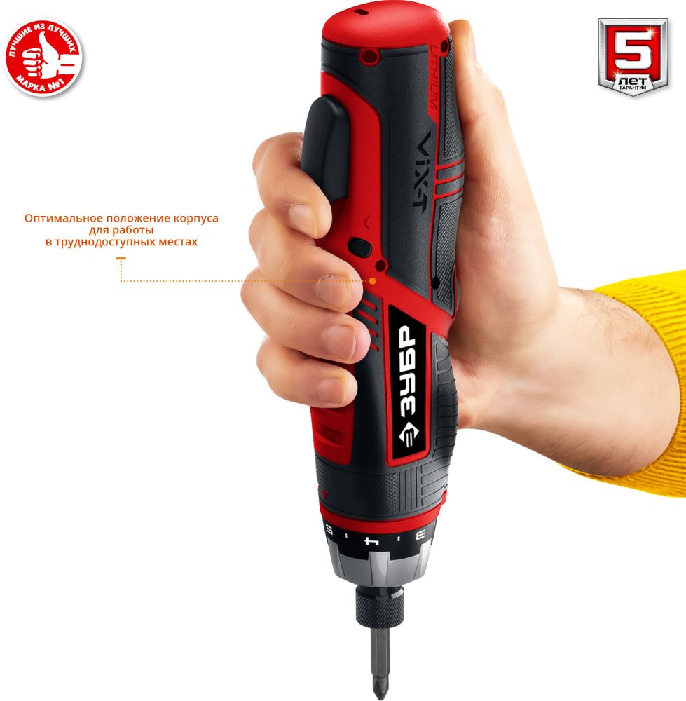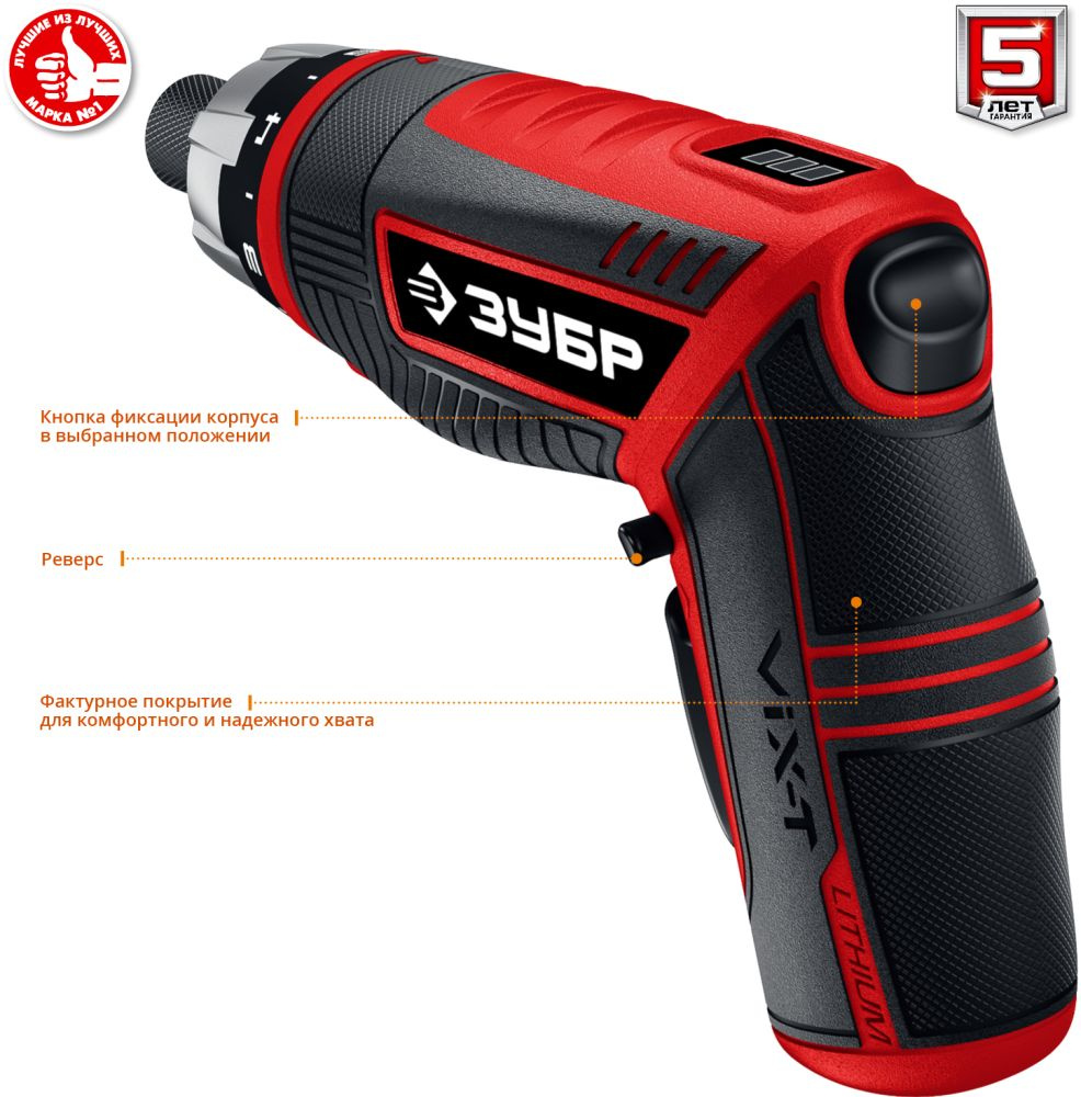 Многофункциональная отвертка с изменяемыми положениями рукоятки и регулировкой крутящего момента. Компактная отвертка с эргономичным дизайном и широким набором функций. Литий-ионная технология ЗУБР нового поколения. Трансформируемый корпус для удобного хвата при любой работе.