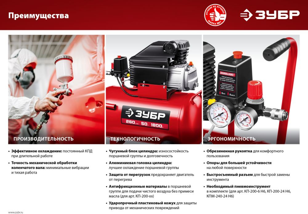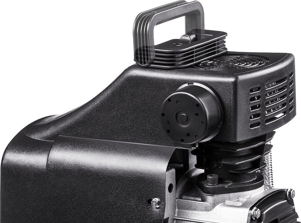 Самовосстанавливающийся термопредохранитель. Регулировка давления на выходе позволяет настраивать давление воздуха зависимости от используемого пневмоинструмента. Механический клапан сброса давления. Шумозащитный пластиковый кожух.